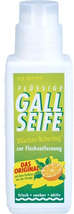 EAN: 4150000692791 - Zur gezielten Fleckenbehandlung. Gallseife wird hergestellt aus Kernseife und Rindergalle. Sie ist für alle Textilien geeignet. Auch im Kaltwasserbereich (zum Beispiel bei Wollwäsche) kann sie eingesetzt werden. - bei die-beraterapotheke.de - aus Yadore Produktdaten ![]() ![]() Blücher-Schering GmbH & Co. KG GALLSEIFE flüssig Blücher Schering 250 ml