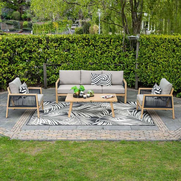 3 Händlerangebote bei billiger.de - Kategorie: Loungemöbel - Garden Impressions - Lieben Sie auch das schöne Decala-Set von Garden Impressions? Dachten Sie, dass dieses Set aus Holz ist? Sehen Sie noch einmal hin!Lounge-Dining-Set aus Aluminium in HolzoptikDas Decala-Set besteht in Wirklichkeit aus hochwertigem Aluminium mit einer speziellen Beschichtung in einer schönen hellen Teakholzoptik. Dadurch sieht es aus, als wäre das Set aus echtem Holz!Die Armlehnen dieses bezaubernden Gartensets sind mit einem TPU-Seil versehen, einem Kunststofffaden, der einen modernen Touch verleiht. Dank der verwendeten Materialien ist das Lounge-Dining-Set Decala leicht und pflegeleicht.Der multifunktionale Tisch bietet Platz für komfortables Essen und gemütliche Sommerabende. Die Kissen sind aus wasserabweisendem Polyester gefertigt, so dass Sie das Wasser nach einem Regenschauer einfach abklopfen können.Die Reinigung des Decala-Sets ist mit Seifenwasser und einem weichen Tuch einfach.Weitere DetailsDas Ecksofa besteht aus zwei Sofateilen und einem zentralen Element und kann sowohl links als auch rechts verwendet werden.Die Maße des Ecksofas betragen 267 x 207 x H75 cm mit einer Tiefe von 82 cm, während der Tisch 150 x 67 x H67,5 cm misst. Die Sitzhöhe beträgt 40,5 cm. - GTIN:8713002583700 ![]() ![]() Garden Impressions Decala Loungeset inkl. Loungetisch Aluminium/Rope/Polyester Natur 58360EG