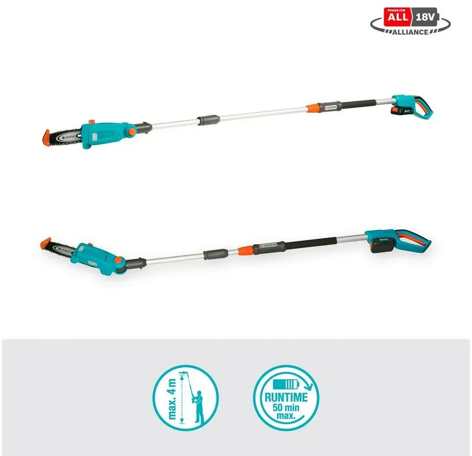 Auf Lager Versand durch AmazonGardena Akku-Teleskop-Hochentaster TCS 20/18V P4A Ready-To-Use Set: Astsäge für bis zu 4 m Reichweite, 20 cm Schwertlänge, abwinkelbarer Kopf, inkl. 18V P4A Akku & Tragegurt (14770-20)