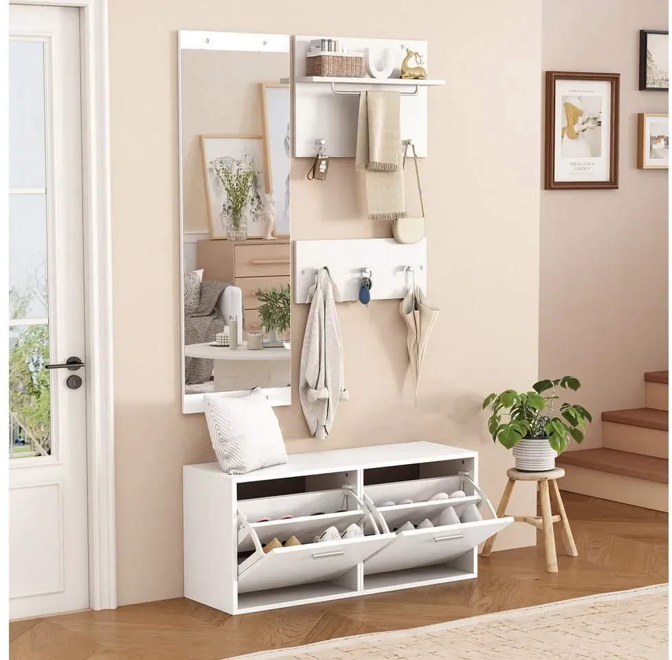 Verfügbarkeit: Auf Lager - Kategorie: Garderoben - GROSSE STABILE WANDGARDEROBE MIT BEWEGLICHEM SPIEGEL. INSGESAMT ca. 90cm BREIT. 30cm TIEF UND 50cm HOCH. AUS BRAUN PATINIERTEM METALL GEFERTIGT. SPIEGELMAßE ca. 70cm x 25cm. - 99,99 Euro bei Amazon Marketplace Home - gefunden von billiger.de Dieses 4-teilige Garderoben-Set bietet viel Stauraum mit Spiegel, zwei Hutablagen und einem Schuhschrank zu einem guten Preis. ![]() ![]() Odikalo Garderoben-Set Kompaktgarderobe Garderobenset, (90*30*41.5cm Garderoben-Set 4-teilig mit Spiegel,2 Hutablage und Schuhschrank.Flur Garderobenständer Kleiderständer Set,Flurgarderoben Set,Kompaktgarderobe mit 6 Kleiderhaken,Weiß) weiß