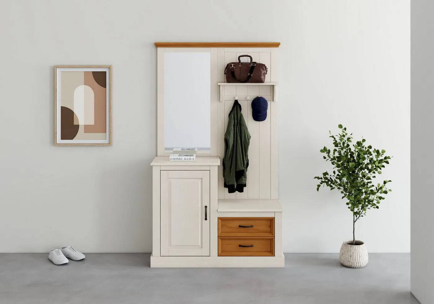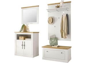 Kommoden Wohnen Aufbewahren Ordnen Schränke, Kommoden Vitrinen - - Produktdetails: Set beinhaltet: In folgenden Farben erhältlich: : Korpus/Front: Rauchsilber NB/Weiß Hochglanz, Farbe Griffe: chromglänzend, Farbe Füße: silber. Details zur Ausstattung: : Laufleisten der Schubkästen aus Metall, Griffe aus Kunststoff, FSC®-zertifiziert. Set bestehend aus: : Paneel, Schuhbank, Kommode, Spiegel. Paneel: : Mit Hutablage, Mit Kleiderstange, 3 Haken, Maße (B/T/H): 90/27/98 cm. Schuhbank: : 4 Fächer, Fachmaße (B/T): ca. 43/36 cm, Maße (B/T/H): 90/40/44 cm. Kommode: : 2 Türen, 2 Schubkästen, 3 Fächer, Fachmaße (B/T): ca. 87/33 cm, 2 herausnehmbare Einlegeböden, Regalböden belastbar bis max. 5 kg, Rückwand gänzlich geschlossen, Mit Füßen, Maße (B/T/H): 90/37/96 cm. Spiegel: : Ohne Rahmen, Maß, Serie: Siena, Farbe Material: Farbbezeichnung: Korpus/Front: Rauchsilber NB/weiß Hochglanz, Schrank: Anzahl Fächer Schrank 2: 3 Stk., Garderobe: Anzahl Haken: 3 Stk., Bank: Anzahl Fächer Bank: 4 Stk., Maßangaben: Breite: 195 cm, Tiefe: 40 cm, Höhe: 197 cm, Lieferung Montage: Lieferzustand: zerlegt, Aufbauhinweise: einfache Selbstmontage mit Aufbauanleitung, Anzahl Packstücke: 5 Stk., Hinweise: Hersteller gemäß den -Bedingungen, Hinweis Maßangaben: Alle Angaben sind ca.-Maße., Markeninformationen: INOSIGN ist eine sorgfältig entwickelte Kollektion von innovativen und außergewöhnlichen Einrichtungsgegenständen - jedes Stück mit einem gewissen Extra. Die Marke folgt weder Stilen noch Epochen, ... Dieses Bestseller-Set im romantischen Landhausstil bietet eine charmante und funktionale Lösung für den Eingangsbereich. ![]() Garderoben-Set HOME AFFAIRE 'Westminster BESTSELLER', weiß (pinie weiß, wotan eiche), Kastenmöbel-Sets, im romantischen Landhausstil, Topseller