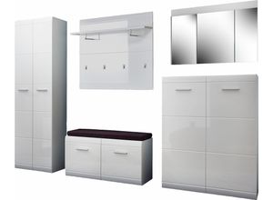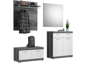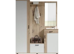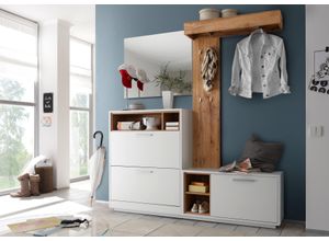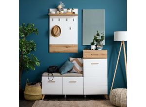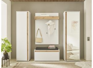 Garderoben Wohnen Aufbewahren Ordnen - - Produktdetails: Set beinhaltet: Sein 4tlg Garderoben-Set besteht aus: 1 Schuhschrank, 1 Schuhbank, 1 Garderobenpaneel, 1 Wandspiegel. Details: FSC®-zertifizierter Holzwerkstoff, Pflegeleichte Oberflächen, Viel Stauraum, In hochwertiger Verarbeitung , Moderne Trendfarben, Farbe: Weiß hochglanz folie, Opaque weiß, Artisan Eiche. Schuhschrank: 1x Schublade, 1x Tür, 2x Einlegeboden, Maße (B/T/H): ca. 51,4/34,8/106,5 cm, Belastbarkeit Einlegeboden: 5 kg, Belastbarkeit Schubladen: 2 kg. Schuhbank: 2x Türen, Belastbarkeit 32 kg, Innenmaße (B/T/H): ca. 63,6/33,2/93,5 cm, Maße (B/T/H): ca. 68,5/36,5/98 cm. Garderobenpaneel: 6x Haken, , 1x Hutablage, Maße (B/T/, Serie: Sein, Art Griffe: Griffleiste, Farbe Material: Material Korpus: Spanplatte, Oberflächenbehandlung Korpus: foliert, Material Beschläge: Metall, Oberflächenbehandlung Türen: foliert, Material Einlegeböden: Spanplatte, Material Schubladen: Holzwerkstoff, Oberflächenbehandlung Schubladen: foliert, Material Griffe: Kunststoff, Farbbezeichnung: Opaque weiß, Material: Glas, Hartfaserplatte, Kunststoff, MDF, Metall, Spanplatte, Farbe Einlegeböden: Opaque weiß, Farbe Griffe: Artisan Eiche, Farbe Korpus: Opaque weiß, Farbe Schubladen: Artisan Eiche, Schrank: Art Schrank: Schuhschrank, Tiefe Schrank: 35 cm, Höhe Schrank: 106,5 cm, Gewicht Schrank: 59,7 kg, Anzahl Türen Schrank: 1 Stk., Art Türen Schrank: Drehtür, Anzahl Fächer Schrank: 3 Stk., Belastbarkeit Einlegeböden Schrank: 5 kg, ... Eine Kompaktgarderobe mit Schuhkommode, Paneel, Bank und Spiegel, die eine gute Balance zwischen Preis und Ausstattung bietet. ![]() Kompaktgarderobe HBZ 'Milano mit Spiegel, BxHxT 177x195x32 cm', weiß (weiß, wildeiche), B:177cm H:195cm T:32cm, Holzwerkstoff, Schränke, Mit Schuhkommode, Paneel, Bank und Spiegel