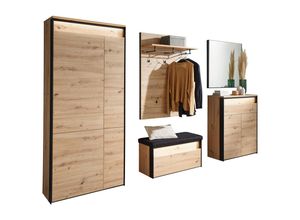 Garderoben Wohnen Aufbewahren Ordnen - - Diese Voleo Garderobe (5-teilig) mit LED-Beleuchtung ergänzt Ihren Flur im zeitgemäßen Look um eine ebenso praktische wie ästhetische Ausstattung. Das stilvolle Zusammenspiel von Artisan-Eichefarben und den Rahmenkanten in Schwarz verleiht dem Möbel-Set mit Schichtstoff-Oberflächen eine selbstbewusste Präsenz. Ein optisches Highlight ist dabei die warmweiße LED-Beleuchtung, die zusätzlich Aufmerksamkeit erregt. Neben der ansprechenden Optik überzeugt etwa der Garderobenschrank (B x H: ca. 88 x 200 cm) mit nützlichem Stauraum: Die 2 Drehtüren, die links sowie rechts montiert sind, lassen sich grifflos öffnen. Dahinter teilen 5 Fachböden den Innenraum übersichtlich auf. Die Kleiderstange bietet sich zum Aufhängen von Jacken und Mänteln an. Weiterer Platz wartet an den 5 Kleiderhaken sowie der Kleiderstange des Garderobenpaneels (B x H: ca. 88 x 126 cm). Außerdem verfügt das Wandgarderoben-Element über eine Hutablage. Loafer, Pumps oder Sneaker lassen sich ordentlich in den 2-türigen Schuhschrank (B x H: ca. 88 x 106 cm) einsortieren: Auf den insgesamt 3 Fachböden kommen bis zu 12 Paar Schuhe unter - die Schublade eignet sich optimal für kleinere Accessoires. Die Garderobenbank (B x H: ca. 92 x 49 cm) mit Klappe sowie Truhe im Sitz verbindet weitere Aufbewahrungsmöglichkeiten mit 2 gemütlichen Sitzplätzen, wobei die Auflage dank Schaumstoff-Polsterung und Synthetikfaser-Bezug in Schwarz für Gemütlichkeit sorgt. Ein ca. 88 x 83 cm (B x ... Dieser große Schwebetürenschrank bietet eine Top-Innenausstattung und ist in verschiedenen Breiten und Höhen erhältlich, ideal für umfangreiche Garderobenbedürfnisse. ![]() Schwebetürenschrank RAUCH 'Kleiderschrank Schrank OTTO´S CHOICE Garderobe AGORDO', beige (beige (champagner)), B:360cm H:210cm T:62cm, Holzwerkstoff, Schränke, Top Innenausstattung, in 4 Breiten und 2 Höhen MADE IN GERMANY, Topseller
