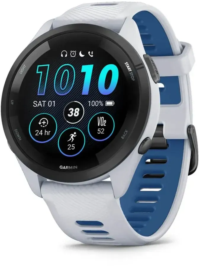 Verfügbarkeit: 2-4 Werktage - Kategorie: Smartwatches - Garmin - Mit der Garmin Forerunner 265 in Weiß/Schwarz holst du dir einen leistungsstarken Begleiter an dein Handgelenk, der dich bei jedem Lauf, jedem Workout und im Alltag optimal unterstützt. Die Kombination aus hell leuchtendem AMOLED-Touchdisplay, smartem Trainingscoaching und elegant-sportlichem Design macht diese GPS-Laufuhr zum idealen Tool für ambitionierte Athlet:innen €“ und alle, die es werden wollen. Das 22 mm Schnellwechsel-Silikonarmband in Weiß/Dunkelblau sorgt dabei für bequemen Sitz und ein modernes Erscheinungsbild Deine Vorteile auf einen Blick 1,3€²€² AMOLED-Touchdisplay mit hoher Auflösung (416 × 416 Pixel) und Always-On-Funktion 46 mm Gehäuse aus faserverstärktem Polymer €“ robust und angenehm leicht (ca. 47 g) Schnellwechsel-Silikonarmband (22 mm) in Weiß/Dunkelblau €“ bequem, flexibel, austauschbar Bis zu 13 Tage Akkulaufzeit im Smartwatch-Modus €“ im GPS-Modus bis zu 20 Stunden Multiband-GNSS mit SatIQ-Technologie €“ präzise Ortung in allen Umgebungen über 30 vorinstallierte Sport-Apps €“ u. a. Laufen, Radfahren, HIIT, Schwimmen, Yoga, Triathlon Garmin Coach, Race Widget und Trainingsbereitschaft €“ personalisierte Trainingsunterstützung Morning Report mit HRV-Status €“ überblick zu Erholung, Schlaf, Stress und Tagesform Running Power, Running Dynamics und VO2 Max €“ perfekte Datenbasis für effektives Lauftraining Health Snapshot, Body Battery, ... Die Garmin Forerunner 265 Pulsuhr in Weiß/Schwarz ist hier zu einem soliden Preis verfügbar. ![]() ![]() Garmin Forerunner 265 Pulsuhr-Weiß,Schwarz