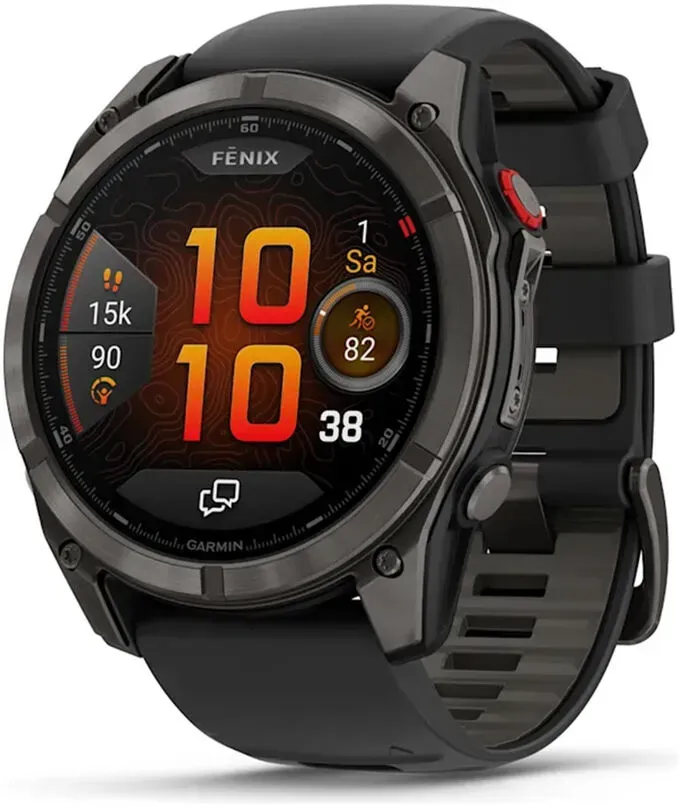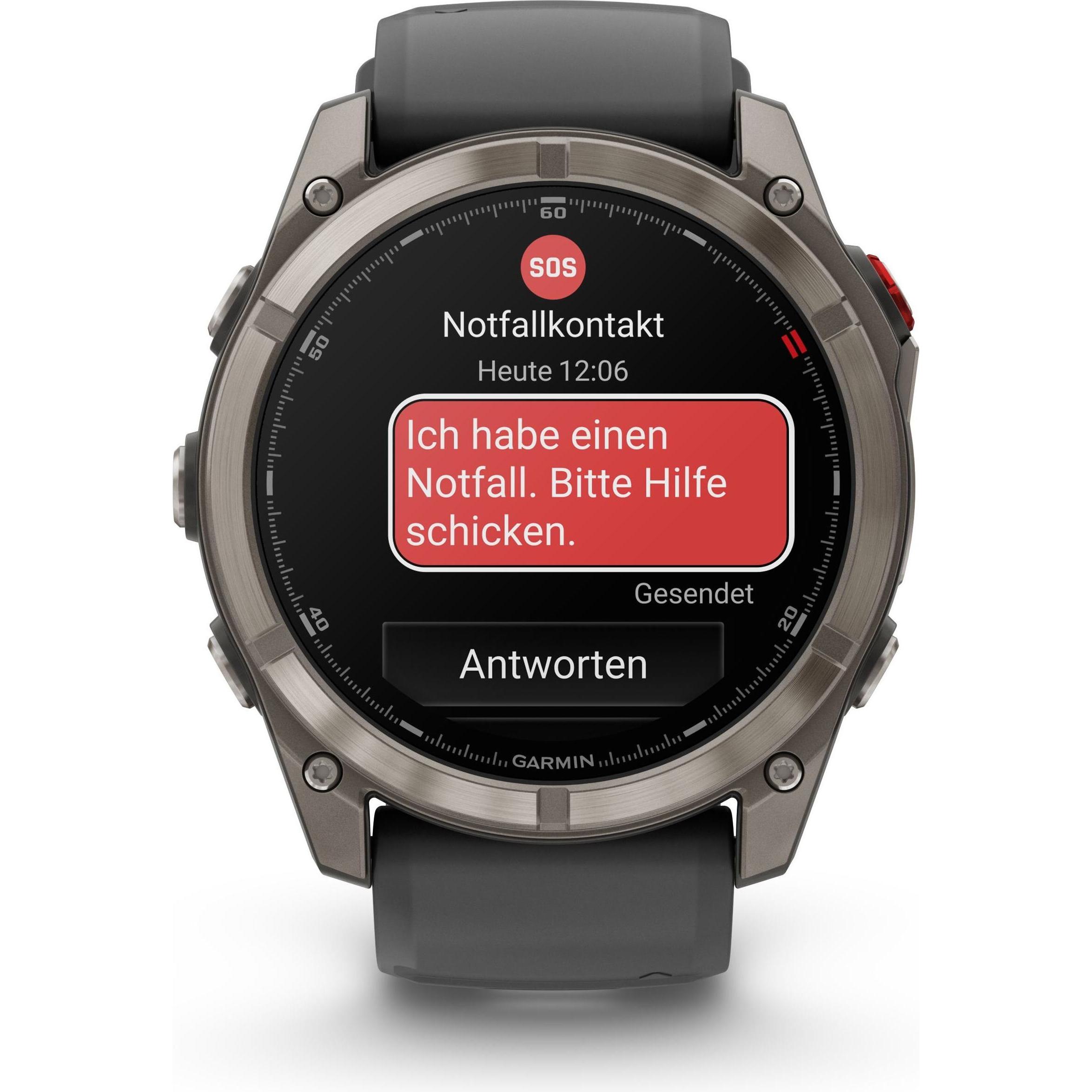 Verfügbarkeit: 1-3 Werktage - Kategorie: Smartwatches - Garmin - GTIN:0753759350918 - Multisport-GPS-Smartwatch mit integrierter inReach®-Technologie für Satelliten- und LTE-Verbindungen; hochwertige Verarbeitung mit AMOLED-Display; Titan-Lünette, Saphir-Glas und Touchdisplay; Sprachanrufe und Standort per LiveTrackTM über Garmin-Messenger-App; 2-Wege-Komunikation und SOS-Notrufe; 24/7-SOS-Notfallunterstützung durch Garmin Response Koordinationszentrum; diverse Funktionen für Fitness- und Krafttraining und sportartspezifische Workouts; Gesundheitsfunktionen; Navigation mit Karten; Round-Trip-Routing; Musikspeicher; LED-Taschenlampe; Uhr mit Wecker, Tipper, Stoppuhr und GPS-Uhrzeitsynchronisation; Akkulaufzeit von bis zu 27 Tagen im Smartwatch-Modus; Tauchtauglichkeit bis zu 40 m Tiefe; verstellbares Silikon-Armband mit einer Breite von ca. 22 mm; Gewicht: ca. 77 g; Durchmesser: ca. 47 mm. - 1049,00 Euro bei Sportscheck - gefunden von billiger.de Die 47mm Garmin Fenix 8 Pro bei Saturn ist eine weitere attraktive Möglichkeit, die hochwertige Smartwatch zu einem guten Preis zu erwerben. ![]() ![]() GARMIN fenix 8 Pro, 47 mm AMOLED Smartwatch Silikon, 22 mm, Graphit/Schwarz