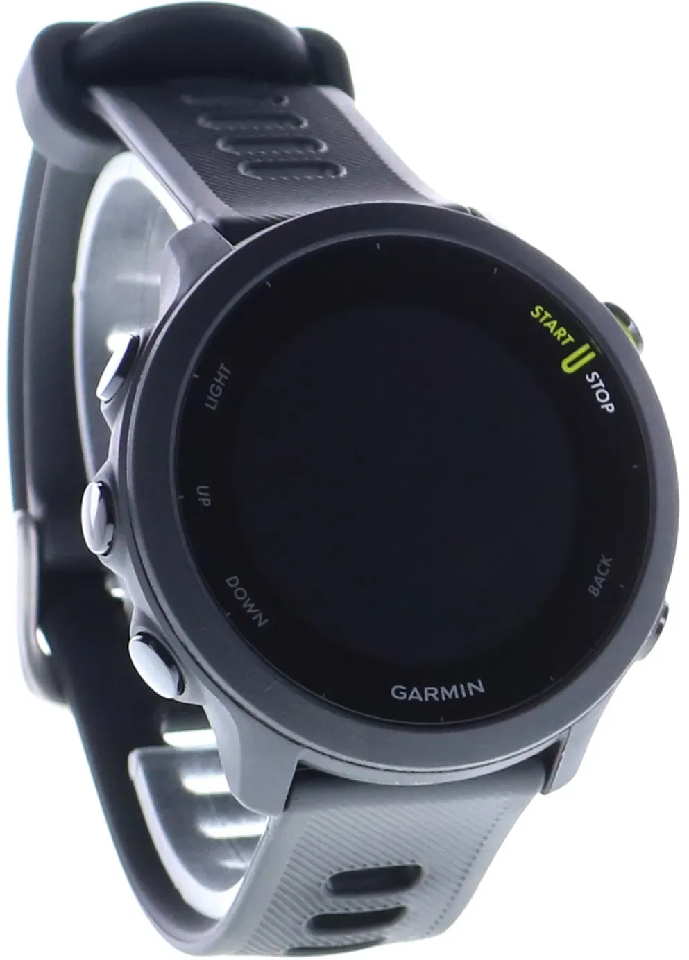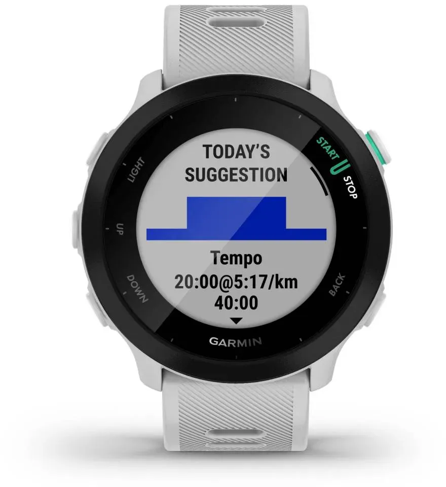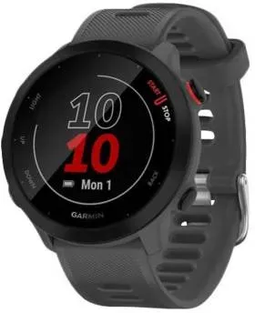 Kategorie: Smartwatches - Garmin - GTIN:0753759279653 - GARMIN Forerunner 55SIEH DICH SELBST ALS LäUFERMit dieser benutzerfreundlichen GPS-Laufuhr steht deinen ersten sportlichen Erfolgen nichts mehr im Weg. Zahlreiche Funktionen helfen dir deinen Zielen Schritt für Schritt etwas näher zu kommen.Features:Zeichne deinen Lauf auf und verfolge dank integrierter Satellitensysteme wie weit, wie schnell und wo du gelaufen bist.Die Herzfrequenzmessung am Handgelenk1 und viele weitere Funktionen helfen dir deine Gesundheit und Fitness im Auge zu behalten.Dank individueller Trainingsempfehlungen, überlässt du bei deinem täglichen Training nichts dem Zufall.High End Lauffunktionen helfen dir dabei, dein volles Potenzial zu erreichen. Bleibe in Bewegung. Dank einer großen Auswahl vorinstallierter Sport-Apps kannst du mehr als nur Lauftrainings aufzeichnen.Dank einer Akku-Laufzeit von bis zu 2 Wochen kannst du mehr Trainings absolvieren, bevor es wieder Zeit zum Aufladen ist.FORM UND FUNKTIONALITäTDiese leichte und angenehm zu tragende Smartwatch ist der perfekte Begleiter um deinen Sport und Alltag in Einklang zu bringen.SPORTGERECHTE MATERIALIENOb du einen 5-km-Lauf absolvierst oder beim HIIT-Training so richtig ins Schwitzen kommst - das sportliche Silikonarmband bietet einen ultimativen Tragekomfort.INTEGRIERTES GPSZeichne auf, wo du läufst, und erhalte genaue Statistiken, u. a. zu Distanz, Pace und Intervallen. So kannst du auch nach deinem Training exakt sehen, wo du unterwegs ... Coolblue bietet die Garmin Forerunner 55 in Grau an, eine stilvolle und funktionale Option. ![]() ![]() Garmin Forerunner 55 Grau