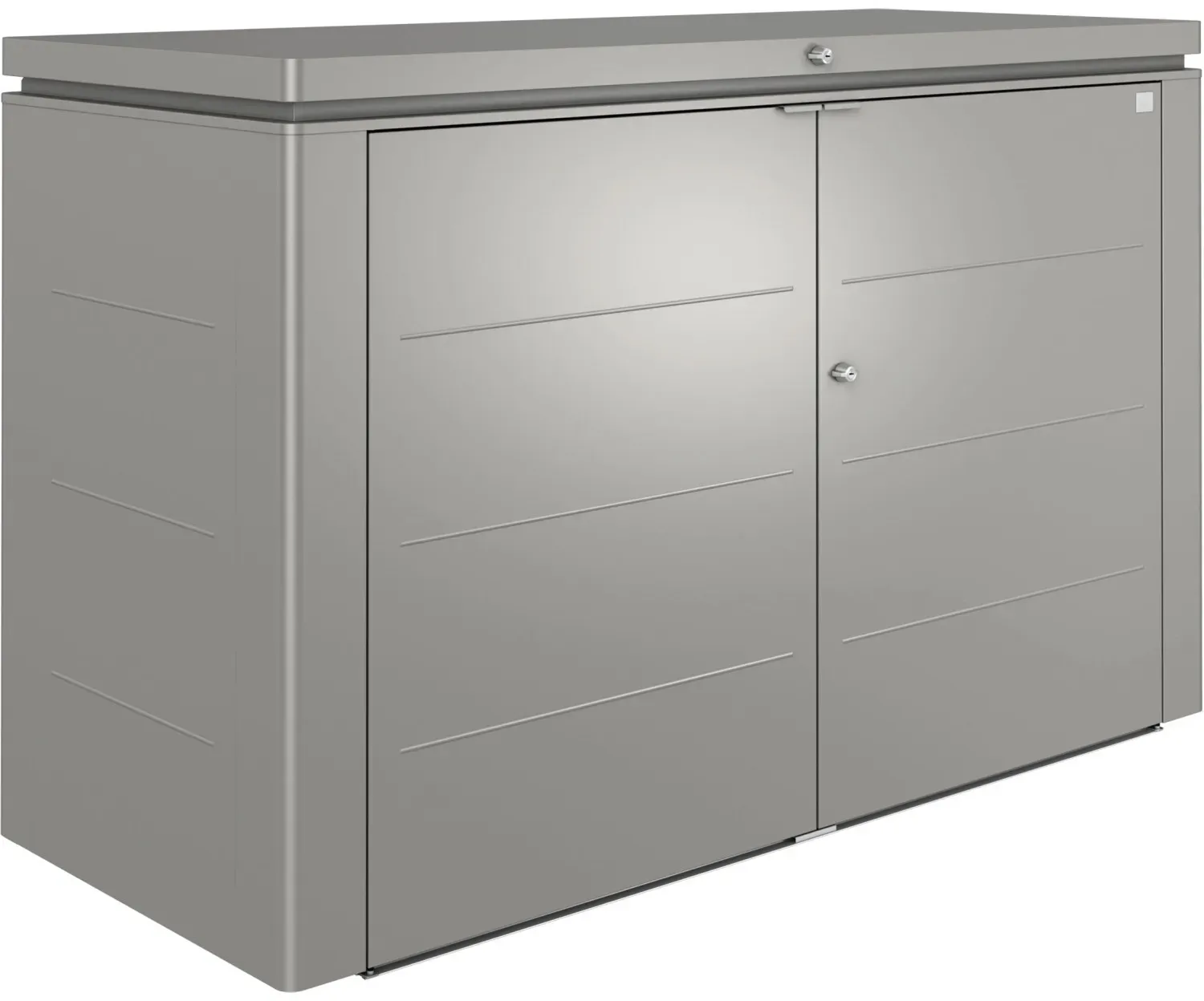 5 Händlerangebote bei billiger.de - Kategorie: Sonstige Gartenmöbel - Biohort - Die Biohort Gartenbox HighBoard ist eine praktische Metall-Aufbewahrungsbox für den Garten. Sie kann als Mülltonnenbox oder Fahrradgarage genutzt werden oder bietet alternativ einen wettergeschützten Stauraum für Grill, Grillutensilien, Gartenwerkzeug, Pflanztöpfe, Spielzeug, Pool-Zubehör und vieles mehr. Regenwasserdichte Kissenbox Die Seitenwände und Türen der Gartenbox sind aus feuerverzinktem, polyamid-einbrennlackiertem Stahlblech gefertigt. Der Deckel besteht aus pulverbeschichtetem Aluminium. Somit ist die Auflagenbox wasserdicht und schützt den Inhalt vor Nässe und Schimmelbildung. Aufbewahrungsbox mit Deckel und Türen Die Metallbox lässt sich nicht nur nach oben öffnen, sondern verfügt auch über zwei große Flügeltüren. So lassen sich auch größere Gegenstände wie Fahrräder, Mülltonnen, Grills oder Rasenmäher einfach unterbringen. Der Deckel und die Türen sind mit Gasdruckfedern ausgestattet, die das öffnen und Schließen komfortabler gestalten. Mit dem Drehknebel-Zylinderschloss schließen Sie die die Box bei Bedarf ab, sodass der Inhalt vor Diebstahl geschützt ist. Die Box kann mit zusätzlichen Halterungen und Einlegeböden (beides separat erhältlich) ergänzt werden, sodass Sie den Platz optimal nutzen können. - GTIN:9003414730250 ![]() ![]() Biohort HighBoard 200 Silber-Metallic