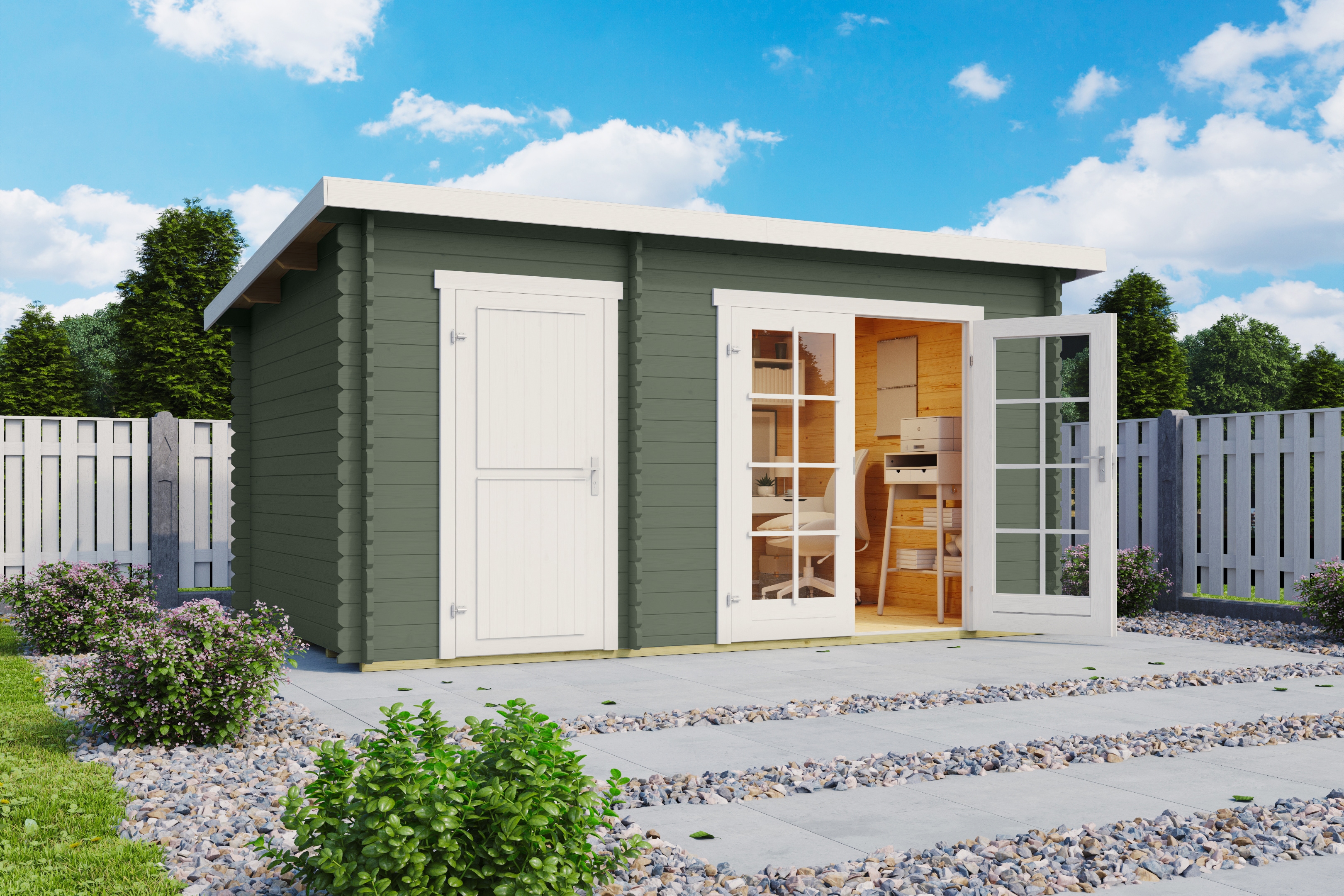 Garten & Freizeit Schuppen, Garagen & Ordnung im Garten Gartenhäuser Holz-Gartenhäuser Outdoor Ausrüstung - EAN:4251554408897 - Hohe Stabilität Modernes Design Massivholzdach Artikeldetails des Gartenhauses: Außenmaß: 320 x 440 cm Sockelmaß: 300 x 420 cm Grundfläche: 12,60 m² Seitenwandhöhe: ca. 216 cm Gesamthöhe: ca. 257 cm Rauminhalt: ca. 28,9 m³ 1x Leimholz-Doppeltür: ca. 154 x 185 cm 1x Leimholz-Einzeltür (Vollholz) 2x bodentiefes Fenster: ca. 45 x 185 cm 4x Ausstellfenster: ca. 99 x 134 cm Wandstärke: 40 mm Im Lieferumfang des Gartenhauses Kim-40 enthalten: Massivholzdach aus Nut- und Federbrettern alle Blockbohlen mit 4-fach Eckausfräsung (wind- u. regendicht) Verglasung bei Türen & Fenstern aus Echtglas hochwertige Doppeltür mit Leimholzrahmen hochwertige Einzeltür mit Leimholzrahmen 2x bodentiefe Fenster (feststehend) 4x Ausstellfenster zum öffnen hochwertige Türschwelle aus Aluminium Schloss, Drückergarnitur, Montagematerial & Montageplan Sturmsicherung auf der Innenseite Lieferung ohne Dachpappe Lieferung in natur ohne Farbbehandlung Wenn bei Fenstern oder Türen Sprossen im Lieferumfang sind, - gefunden von Kelkoo Ein Pultdach Gartenhaus mit Anbau, das zusätzlichen Stauraum oder einen überdachten Bereich bietet. Manomano.d e