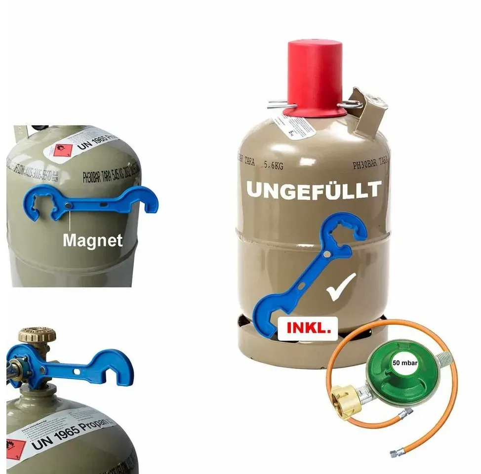 Kategorie: Grillzubehör - Bluecraft - GTIN:4260020512549 - Lieferumfang: 5 kg Propangasflasche grau Neu LEER, Inkl. 2 in 1: Gasreglerlöser und 17er Schlüssel im Wert von 12,95 für ein kraftsparendes Anschließen und Lösen von Kleinflaschengasreglern und Gasschläuchen mit 1/4'' überwurfmutter Perfekt zum Grillen, Kochen, Heizen, beim Camping, im Straßenbau, zum Löten etc. Eigentumsflasche, mindestens für geprüft, inklusive roter Schutzkappe Diese Gasflasche kann deutschlandweit an vielen Annahmestellen wie, z.B. Baumärkten, Tankstellen, Campingplätzen, Campingfachgeschäften etc. getauscht werden Flaschensystem: Die grauen Gasflaschen bezeichnet man als Nutzungs- bzw. Umlaufflaschen - 39,00 Euro bei Amazon Marketplace Home - gefunden von billiger.de Eine weitere gute Option für eine leere 5 kg Gasflasche, die mit einem Gasregler-Löser geliefert wird. ![]() ![]() S&E Bluecraft 5 kg Gas-Flasche Propangas Neu, ungefüllt, leer, für Gasgrill, Gaskocher inkl. CAGO Gasregler-Löser mit Magnet