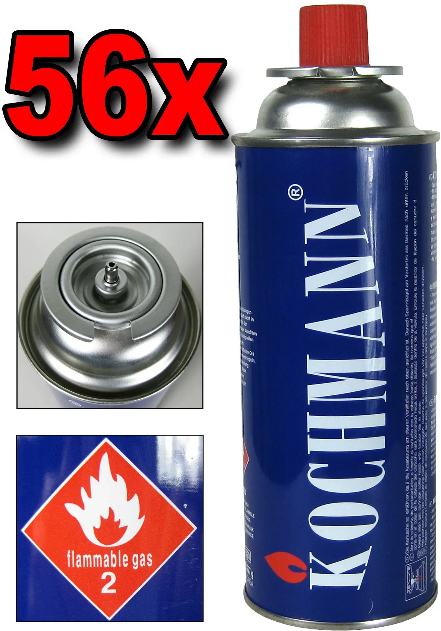 Kategorie: Kocher-Zubehör - Kochmann Germany - Geprüft: Unsere Gaskartuschen sind geprüft und bieten Ihnen die Sicherheit und Qualität, die Sie erwarten. Typ MSF-1A: Diese Kartuschen entsprechen dem Standardtyp MSF-1A, der mit vielen Gaskochern und -geräten kompatibel ist. Hohe Kompatibilität: Einsetzbar in einer Vielzahl von Geräten, darunter TC-SUN-02, CP 250, Evergreen EGP 1000, ST-7.000, ST 10.000, TLB-102N, PG - 1770, Jinyu, TouchLite, Kochmann, Euro GT und Bistro Active. Lange Brenndauer: Je nach Gaskochertyp und Einstellung beträgt die Brenndauer 1,5 bis 3 Stunden, was Ihnen ausreichend Zeit für das Kochen und Erwärmen Ihrer Mahlzeiten bietet. Netto-Gewicht: Jede Kartusche hat ein Netto-Gewicht von 227 g, ideal für den einfachen Transport und die Lagerung. Zuverlässige Energiequelle: Die hochwertige Butanfüllung sorgt für eine konstante und zuverlässige Flamme, die ideal zum Kochen, Grillen und Erhitzen geeignet ist. Einfache Handhabung: Die Kartuschen lassen sich mühelos austauschen und sind sofort einsatzbereit. Vielseitig einsetzbar: Dank der universellen Kompatibilität können Sie diese Gaskartuschen in einer Vielzahl von Gaskochern und -geräten verwenden. Perfekt für: Camping: Ob beim Wochenendausflug oder langen Campingurlaub, diese Gaskartuschen sind die ideale Energiequelle. Picknicks: Genießen Sie warme Mahlzeiten im Freien mit minimalem Aufwand. Outdoor-Abenteuer: Ideal für alle Outdoor-Enthusiasten, die eine zuverlässige und portable Energiequelle ... Dieses 56er-Pack von ZMC ist eine sehr wirtschaftliche Lösung für extrem häufigen Gebrauch oder größere Veranstaltungen. ![]() ![]()