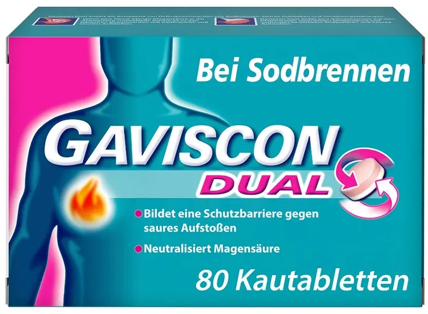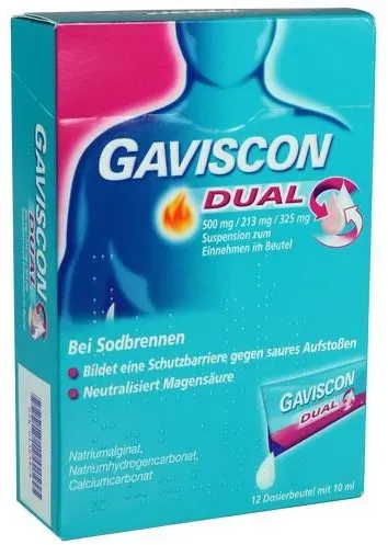 Gaviscon dual META PreisvergleichMit dem Meta-Preisvergleich suchen Sie gleichzeitig bei den großen Preisvergleich Portalen!Jetzt live Suche nach gaviscon dual starten! Gaviscon dual KaufberatungWas ist Gaviscon Dual?Gaviscon Dual ist ein rezeptfreies Arzneimittel zur Behandlung von säurebedingten Symptomen des gastroösophagealen Reflux, wie Sodbrennen, saures Aufstoßen und Verdauungsstörungen[1][3][5]. Es wirkt durch eine Kombination aus Alginat (aus Braunalgen), Calciumcarbonat und Natriumhydrogencarbonat. Das Alginat bildet eine gelartige Schutzbarriere auf dem Mageninhalt, die das Aufsteigen von Magensäure in die Speiseröhre verhindert, während Calciumcarbonat und Natriumhydrogencarbonat die Magensäure neutralisieren[1][3][5]. Die Wirkung hält bis zu vier Stunden an[1][7]. Produktvarianten und BeliebtheitGaviscon Dual gibt es in zwei Hauptformen, die beide sehr beliebt sind:
