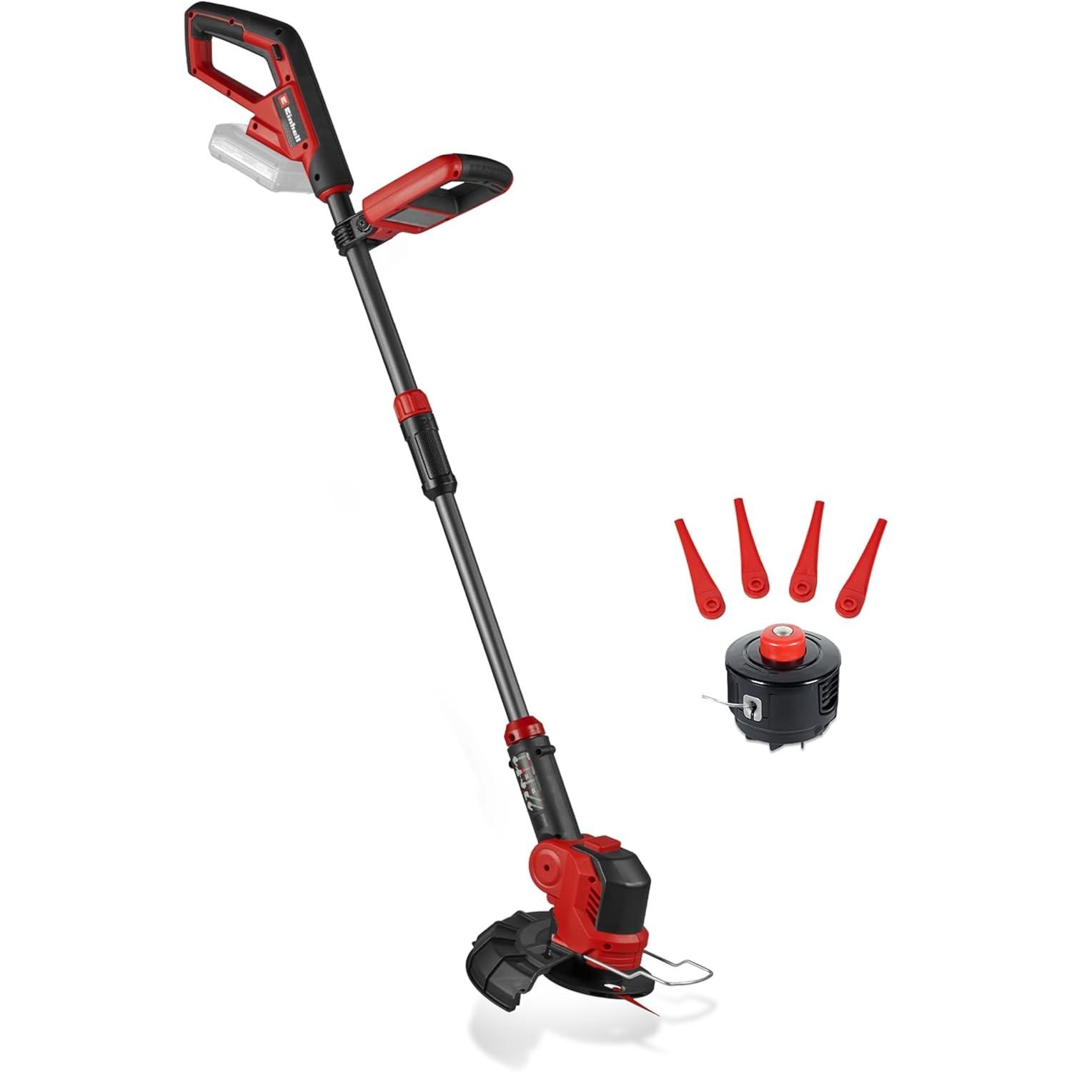 Zustand: Neu - Rasentrimmer - Einhell - 3411256 - EAN: 4006825684117 - Power X-Change - Der Einhell Akku-Rasentrimmer GE-CT 18/25-1 Li-Solo ist Teil der Power X-Change Familie. Akkus, Ladegeräte und Systemgeräte sind flexibel miteinander kombinierbar. Verstellbarer Motorkopf - Der Rasentrimmer verfügt über einen 180° drehbaren und 3-fach neigbaren Motorkopf zum einfachen Trimmen von Rasenflächen an Kanten oder Engstellen. Schnittwechsel - Der Akku-Rasentrimmer kann sowohl mit Kunststoffmessern als auch mit dem im Lieferumfang enthaltenen Fadenkopf samt Fadenspule betrieben werden. Komfortable Handhabung - Mithilfe des verstellbaren Zusatzhandgriffs und des teleskopierbaren Führungsholms kann der Rasentrimmer auf die eigene Körpergröße angepasst werden. Schutz für Blumen - Der Flowerguard aus stabilem Metall schützt Blumen, Zierpflanzen und andere empfindliche Objekte vor dem Messer des Akku-Rasentrimmers. Messer - Um die Messer für den schnellen Wechsel parat zu haben, ist ein praktisches Aufbewahrungsfach für die 20 mitgelieferten Kunststoffmesser im Zusatzhandgriff integriert. Lieferung ohne Akku - Der Einhell Akku-Rasentrimmer GE-CT 18/25-1 Li-Solo wird ohne Power X-Change Akku und Ladegerät geliefert. Diese sind separat erhältlich. - Verkäufer: Einhell Germany AG im amazon.de Marketplace ![]() ![]() Einhell Akku-Rasentrimmer GE-CT 18/25-1 Li-Solo Power X-Change (18 V, 25 cm Schnittbreite, dreh-/neigbarer Motorkopf, inkl. 20x Kunststoffmesser, 1x Fadenspule, ohne Akku)