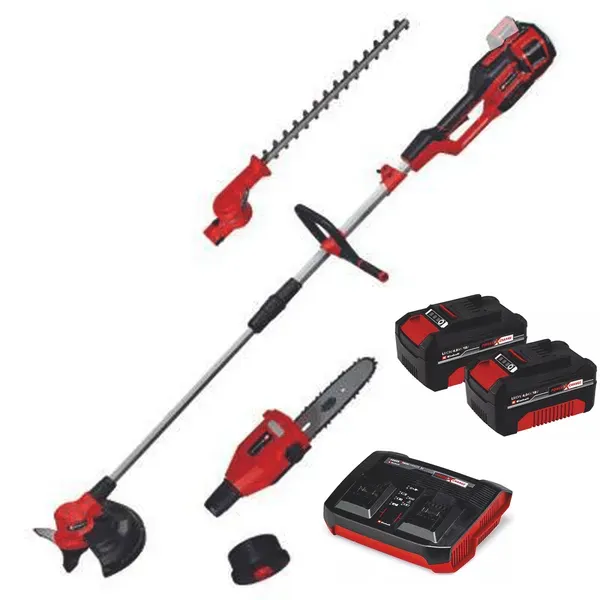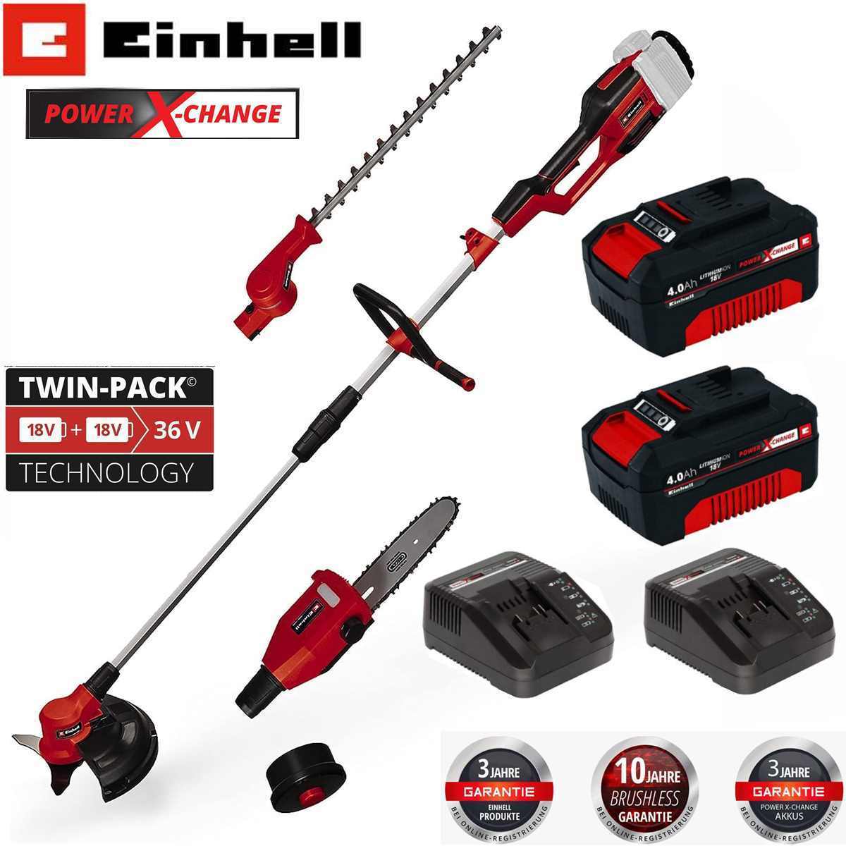 EAN: 4066738037066 - Einhell Akku-Multifunktionswerkzeug GE-LM 36/4in1 Li-Solo Power X-Change (Lithium-Ionen, 4 in 1 - Heckenschere, Kettensäge, Trimmer, Motorsense, mit 2 x Akku 18V 4.0 Ah und Ladegerät)ArtikelbeschreibungDas Einhell Akku-Multifunktionswerkzeug GE-LM 36/4in1 Li-Solo ist ein hochwertiges Mitglied der flexiblen Power X-Change-Reihe von Einhell. Angetrieben wird das Gerät von dem Einhell PurePOWER Brushless Motor. Dieser bürstenlose Motor bietet mehr Kraft und eine längere Laufzeit als herkömmliche Kohlebürsten-Motoren. Die hochwertigen Messer der Heckenschere bestehen aus lasergeschnittenem und diamantgeschliffenem Stahl. Zudem verfügt das Multifunktionswerkzeug beim Hochentaster über OREGON-Qualitätsschwert und kette. Durch die Verlängerungsstange können auch höhere Hecken gestutzt und äste geschnitten werden. Der ölbehälter sorgt im Betrieb für die automatische Kettenschmierung. Der Heckenscherenkopf ist 7-fach neigbar, die Fadenspule des Trimmers ist mit Tippautomatik ausgerüstet, zudem verfügt das Multifunktionswerkzeug über ein hochwertiges 3-Zahn-Messer. Komfortabel im Einsatz ist das Multifunktionswerkzeug durch den verstellbaren Zusatzhandgriff und den Tragegurt. Mitglied der Power X-Change Familie, 2x18V Batterie notwendigBürstenloser Motor mehr Power und längere LaufzeitMesser aus lasergeschnittenem und diamantgeschliffenem StahlHeckenscherenkopf 7-fach neigbarOREGON-Qualitätsschwert und Ketteölbehälter für automatische KettenschmierungFadenspule ... Dieses Angebot ist empfehlenswert, da es eine akkubetriebene Multifunktions-Motorsense inklusive 2x 4Ah Akkus bietet, was ein sofortiges Arbeiten ermöglicht. ![]() ![]() Einhell GE-LM 36 - Akkubetriebene Multifunktions-Motorsense - 18V - 2x 4Ah