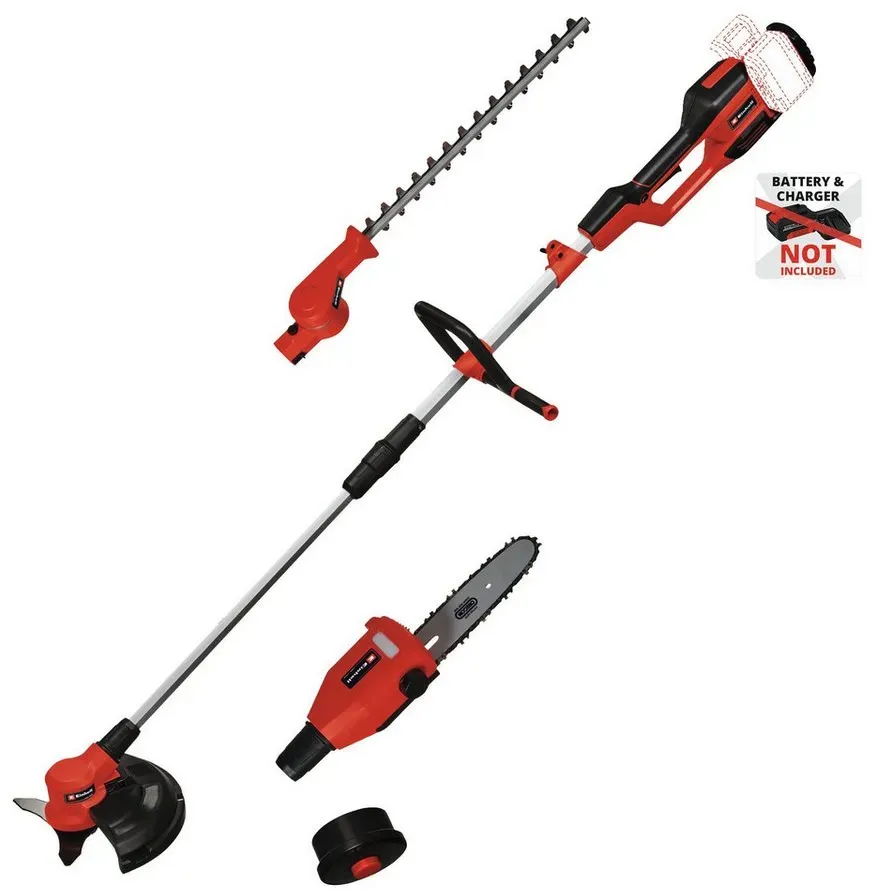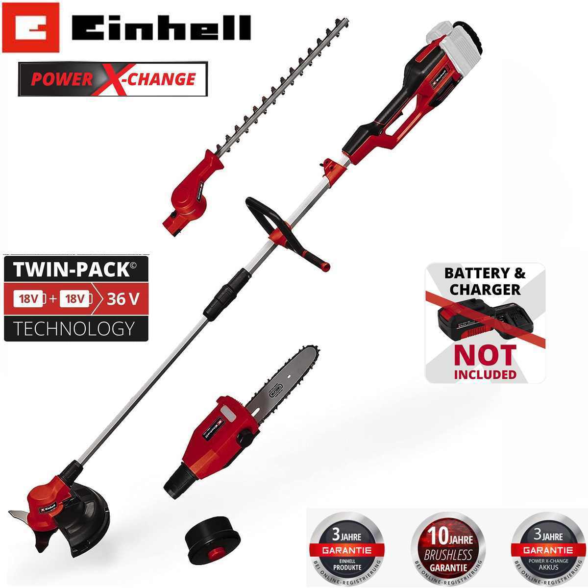 EAN: 4066738037042 - Einhell Akku-Multifunktionswerkzeug GE-LM 36/4in1 Li-Solo Power X-Change (Lithium-Ionen, 4 in 1 - Heckenschere, Kettensäge, Trimmer, Motorsense, ohne Akku und Ladegerät)ArtikelbeschreibungDas Einhell Akku-Multifunktionswerkzeug GE-LM 36/4in1 Li-Solo ist ein hochwertiges Mitglied der flexiblen Power X-Change-Reihe von Einhell. Angetrieben wird das Gerät von dem Einhell PurePOWER Brushless Motor. Dieser bürstenlose Motor bietet mehr Kraft und eine längere Laufzeit als herkömmliche Kohlebürsten-Motoren. Die hochwertigen Messer der Heckenschere bestehen aus lasergeschnittenem und diamantgeschliffenem Stahl. Zudem verfügt das Multifunktionswerkzeug beim Hochentaster über OREGON-Qualitätsschwert und kette. Durch die Verlängerungsstange können auch höhere Hecken gestutzt und äste geschnitten werden. Der ölbehälter sorgt im Betrieb für die automatische Kettenschmierung. Der Heckenscherenkopf ist 7-fach neigbar, die Fadenspule des Trimmers ist mit Tippautomatik ausgerüstet, zudem verfügt das Multifunktionswerkzeug über ein hochwertiges 3-Zahn-Messer. Komfortabel im Einsatz ist das Multifunktionswerkzeug durch den verstellbaren Zusatzhandgriff und den Tragegurt. Die Lieferung erfolgt ohne Akku und Ladegerät, diese sind separat erhältlich, zum Beispiel als praktisches Starter-Set. Mitglied der Power X-Change Familie, 2x18V Batterie notwendigBürstenloser Motor mehr Power und längere LaufzeitMesser aus lasergeschnittenem und diamantgeschliffenem ... Dieses Angebot ist empfehlenswert, da es ein umfassendes Akku-Multifunktions-Werkzeug mit 4in1-Funktionen (Motorsense, Heckenschere, Hochentaster) ohne Akku und Ladegerät darstellt. ![]() ![]()