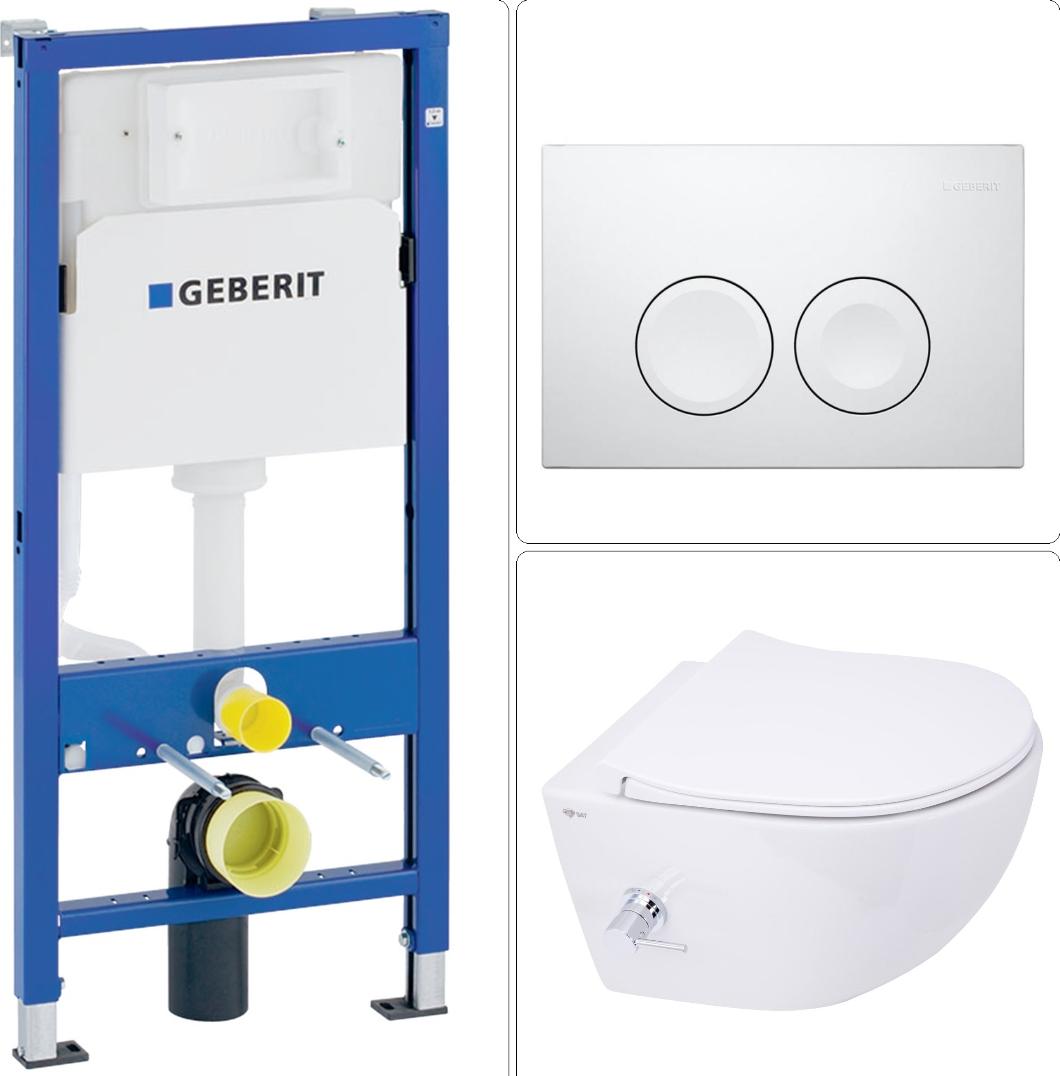 Kategorie: WCs - Geberit - GTIN:4251830913978 - FREE Wand WC spülrandlos mit SoftClose WC-Sitz & GEBERIT BASIC Vorwandelement + DELTA25 Betätigungsplatte, weiß Das FREE Wand WC ist ein absolutes Ass in Sachen Hygiene! Es verfügt über eine aus Silberionen bestehende, spezielle Glasurbeschichtung, welche 99,9% des Bakterienabfalls verhindert. Durch den fehlenden Spülrand reduzieren sich die Ablagerungen von Bakterien an versteckten Stellen. Auch die edle Keramikoberfläche ist schmutzabweisend und daher besonders pflegeleicht. Der praktische WC-Sitz lässt sich mühelos abnehmen und verhilft so zu einer gründlichen Reinigung. Das moderne Design und die klare Formgebung sorgen für einen unverwechselbaren Hingucker in Ihrem Bad! Eigenschaften WC: Material: Keramik Maße (L x B x H): 51 x 35,5 x 35 cm Farbe: weiß Tiefspüler spülrandlos, mit kleinem Spritzrand Befestigungslochabstand 18 cm Abgang waagerecht verdecktes Befestigungssystem für alle Vorwandelemente passend inkl. Befestigungsmaterial Eigenschaften WC-Sitz: Material: Duroplast Maße (L x B x H): 42,8 x 36,3 x 4 cm Farbe: weiß mit Absenkautomatik TakeOff Funktion: im 90° Winkel abnehmbar genormter Lochabstand Edelstahlscharniere Eigenschaften Vorwandelement: Für Trockenbau Für Wand-WCs mit Anschlussmaßen nach DIN EN 33:2011-11 Für 1-Mengen-, 2-Mengen- oder Spül-Stopp-Spülung Ausgerüstet mit Leerrohr für Wasserzuleitung zum Anschluss von Geberit AquaClean Dusch-WCs Maximale Wassertemperatur: 25°c Spülmenge Werkseinstellung: ... Dieses hochwertige Set beinhaltet ein SAT Aquacare Wand-Dusch-WC, Schallschutz und das Geberit Basic Vorwandelement mit Delta25 Betätigungsplatte in Weiß, ideal für gehobene Ansprüche. ![]() kaufland.d e SAT Aquacare Wand-Dusch-WC spülrandlos mit SoftClose WC-Sitz, Schallschutz & GEBERIT BASIC Vorwandelement + DELTA25 Betätigungsplatte weiß
