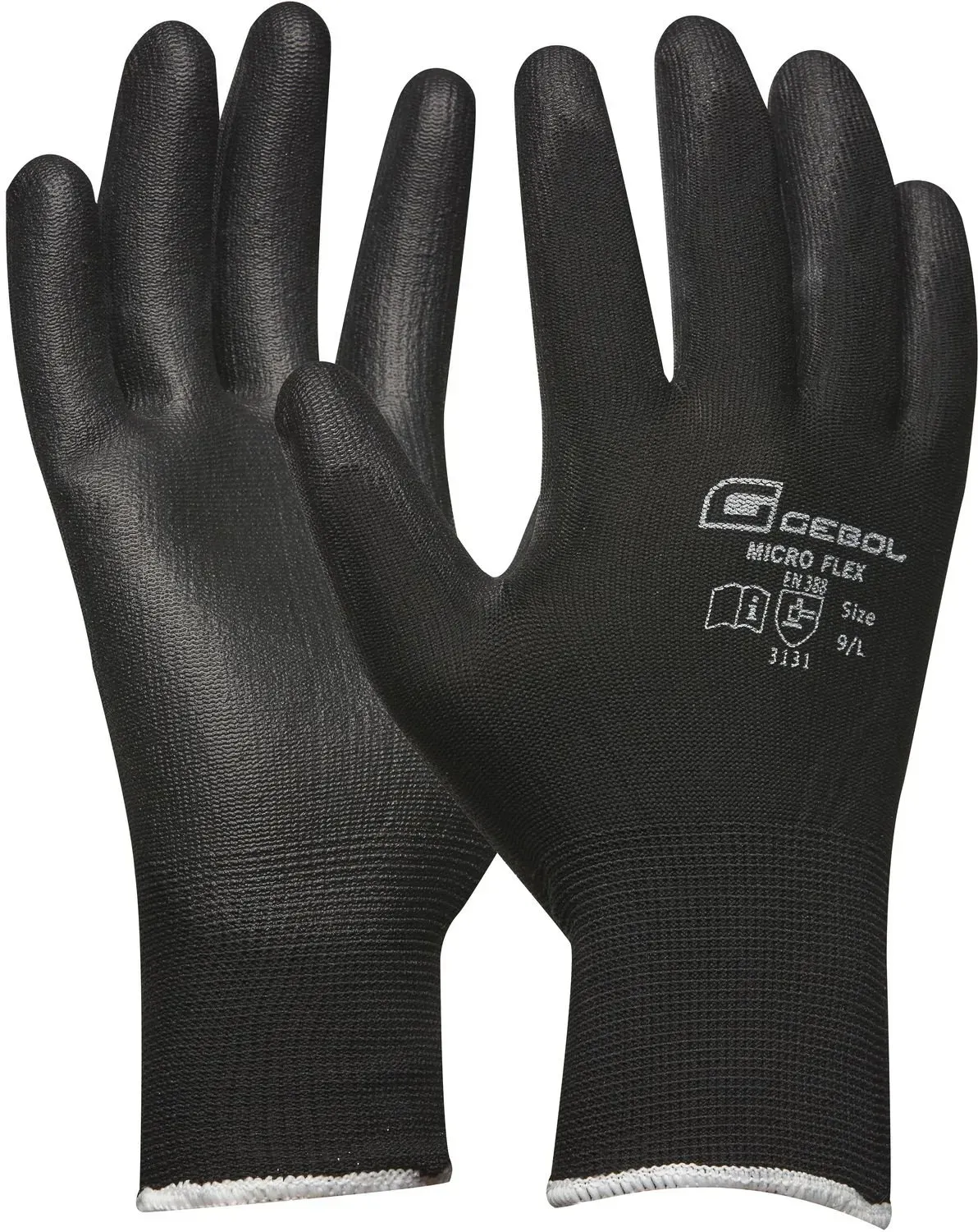 Zustand: Neu - Arbeitshandschuhe - Gebol - 709245 7092451 - EAN: 9002701924518 - Schutzhandschuh aus nahtlosem Feinstrick in Polyester mit Polyurethan Innenhandbeschichtung hohe Abriebfestikeit | gute Passform dünnes Material für gutes Tastgefühl zum Einsatz im Baugewerbe, auf Baustelle, für Bauarbeiten, im Stahlbau, am Bau, beim hantieren mit Baumaterial, Versand und Lagerarbeiten, Logistik, Garten, Hobby, Montage, KFZ Werkstatt€¦ nach Norm EN 388 | Kategorie II - Verkäufer: Martensen Handels & Service GmbH im amazon.de Marketplace Dieses Angebot für 3,20 Euro bietet ein einzelnes Paar in Größe 10 in Schwarz, ideal für den täglichen Gebrauch. ![]() ![]() Gebol Schutzhandschuh Micro Flex schwarz Größe 10