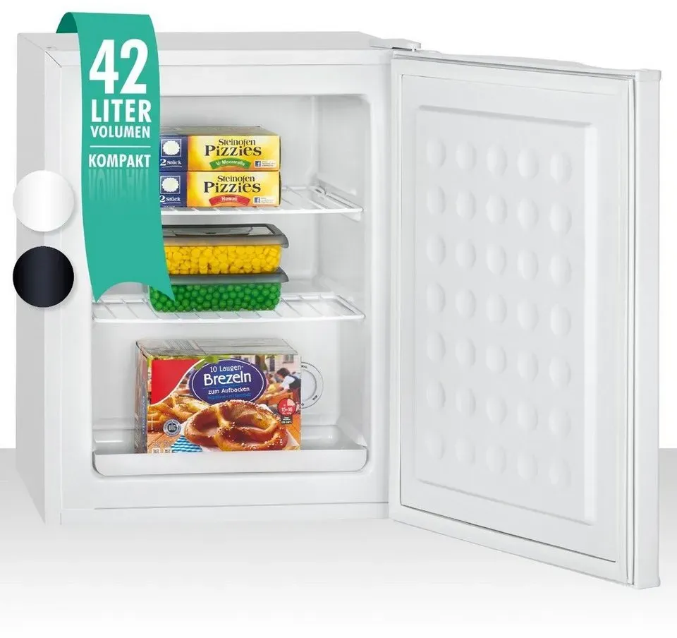 Haushaltsgeräte Große Haushaltsgeräte Gefrierschränke Gefriergeräte - EAN:4060656105388 - Allgemeine Beschreibung Der Klarstein Garfield Eco Mini-Gefrierschrank ist ein kompakter und sparsamer 4-Sterne-Gefrierschrank mit einem Nutzinhalt von 34 Litern. Er bringt frischen Wind in die Küchen von Singles und kleinen bis mittleren Haushalten und ermöglicht das langfristige Tiefkühlen von Lebensmitteln, selbst bei begrenzten Platzverhältnissen. Mit seinem klaren Design und dem weißen Gehäuse fügt er sich elegant in jede Küchenlandschaft ein. Technische daten Nutzinhalt: 34 Liter Abmessungen: ca. 44 x 51 x 47 cm (BxHxT) Gewicht: ca. 14,5 kg Stromverbrauch: 148 kWh/Jahr Stromversorgung: 220-240 V~ 50 Hz Kompatibilität und Zubehör 1 x Gefrierschrank 1 x Eiswürfelbereiter 2 x Abstandshalter mehrsprachige Bedienungsanleitung Installation Der Türanschlag des Gefrierschranks kann mit wenigen Handgriffen gewechselt werden, um ihn optimal an die Stellplatzwünsche anzupassen. Anwendung Der Garfield Eco Mini-Gefrierschrank eignet sich ideal zum Einfrieren von Tiefkühlkost wie Pizza, - gefunden von Kelkoo Der Exquisit Gefrierschrank mit 63 Litern ist eine kompakte und effiziente Option für kleinere Mengen Gefriergut. ![]() ![]() Exquisit Gefrierschrank GS111-330E weissPV | Tiefkühlschrank klein 63 L Volumen | 4 Sterne Gefrieren | Gefrierschrank klein | 45 cm Breite
