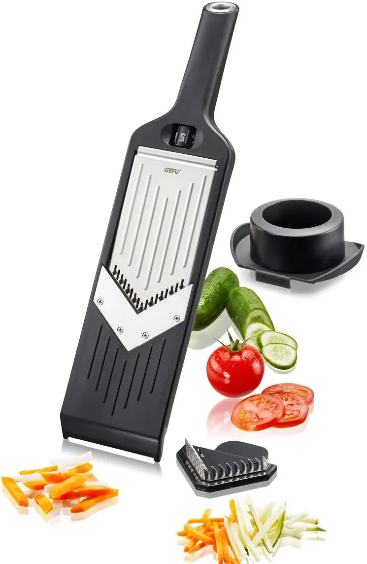 Küchenhelfer Wohnen Küchenutensilien - - Der Gemüsehobel 'Violi' von Gefu ist ein wahrer Schneidekünstler. Hochwertiger japanischer Klingenstahl sorgt für ausgezeichnete Schärfe und liefert präzise Ergebnisse beim Zubereiten und Kochen. Ob frische Salate, dampfende Eintöpfe oder knackige Snacks - dieser Gemüsehobel steht stets am Anfang Ihrer Lieblingsrezepte. Mit 5 Schnittstärken bringt der V-Hobel Möhren, Gurken oder Tomaten für jeden Anlass perfekt in Form und verwandelt verschiedene Gemüsearten und Obstsorten im Handumdrehen in praktische Scheiben. Rutschfeste Füße sowie Einkerbungen zur Fixierung an Töpfen und Schüsseln gestalten das Arbeiten mit dem Küchenhobel ausgesprochen einfach. Nach dem Einsatz kann Ihr neuer Hobel bequem in der Spülmaschine gereinigt und dank der Sicherheitseinstellung bedenkenlos verstaut werden. Mit diesem Gemüsehobel holen Sie sich tatkräftige Unterstützung in Ihre Küche! - Versandkostenfrei: false - Lieferzeit: 3 Tage - Sofort verfügbar: true - Hersteller-Farbe: schwarz - Farbe: Schwarz - - - bei XXXLutz - gefunden von shopping24 Der Gefu V-Hobel RASPINI ist stufenlos einstellbar und ermöglicht somit flexible Schnittstärken für verschiedene Gemüsesorten. ![]() ![]() GEFU V-Hobel RASPINI Gemüsehobel stufenlos einstellbar