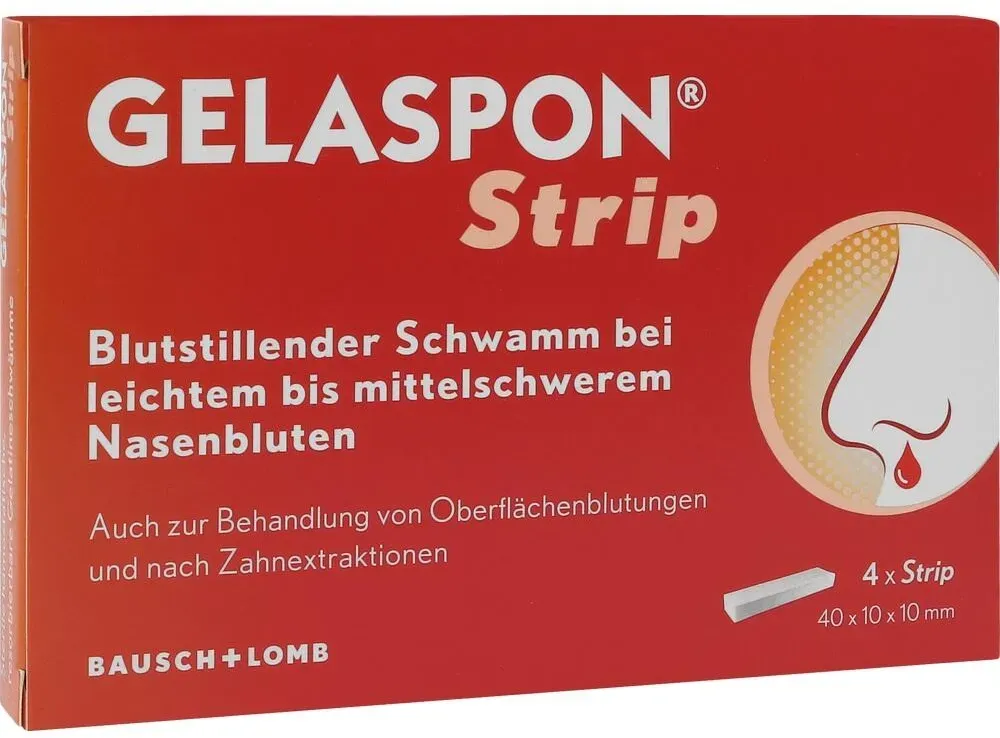Gelaspon - EAN: 4030571007814 - Anwendungsgebiet von Gelaspon Strip zur Blutstillung und WundversorgungGelaspon Strip zur Blutstillung und Wundversorgung kann eingesetzt werden zur lokalen Blutstillung von oberflächlichen Wunden. Mit seinem Tamponadeeffekt eignet es sich besonders gut bei leichtem bis mäßigem Nasenbluten, nach Zahnextraktionen und zur Behandlung von kleinen Oberflächenblutungen.Wirkungsweise von Gelaspon Strip zur Blutstillung und WundversorgungGelaspon Strip zur Blutstillung und Wundversorgung besteht aus 100 % gereinigter Schweine-Gelatine, ist in Wasser unlöslich und vollständig resorbierbar. Mit seiner feinporigen Schwammstruktur und den vielen Kammern kann er das 35-Fache seines Eigengewichts an Blut und anderen Flüssigkeiten aufnehmen. Er ist einzeln verpackt, sterilisiert und für den Einmalgebrauch vorgesehen.Wirkstoffe / Inhaltsstoffe / ZutatenGelaspon Strip zur Blutstillung und Wundversorgung besteht aus 100 % gereinigter Schweine-Gelatine.GegenanzeigenBei bekannter überempfindlichkeit bzw. Allergien gegen Produkte tierischen Ursprungs (Schwein) sollte das Produkt nicht verwendet werden. DosierungAnwendung von Gelaspon Strip zur Blutstillung und Wundversorgung Gelaspon Strip zur Blutstillung und Wundversorgung kann trocken oder mit einer sterilen physiologischen Kochsalzlösung getränkt verwendet werden. Bei trockener Anwendung auf einer feuchten Wunde den Strip in der gewünschten Größe zurechtschneiden, leicht zusammendrücken und unter leichtem ... ![]() ![]() GELASPON Strip Blutstillender Schwamm Streifen Inhalt: 4 St