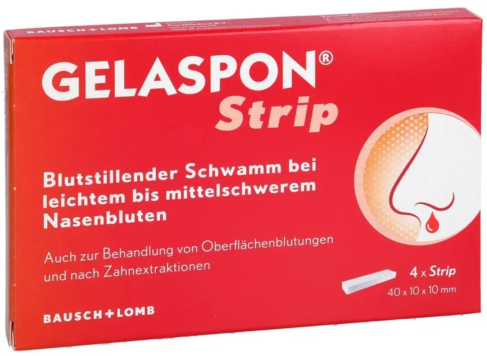 2,76 /St - Kategorie: Arzneimittel - Bausch + Lomb - GTIN:4030571007814 - PZN:17940575 - Wundauflage zur Blutstillung und WundversorgungGelaspon ist ein steriler, resorbierbarer Gelatineschwamm zur Versorgung von kleinen oberflächlichen Wunden. Seine feinporige Struktur aktiviert die Blutgerinnung. Gelaspon Strips haben einen neutralen pH-Wert und sind gut gewebeverträglich. Die steril verpackten Gelaspon Strips lassen sich rückstandslos von oberflächlichen Wunden entfernen. Hohes SaugvermögenDie Funktionsweise von Gelaspon beruht auf seiner feinporigen, porösen Schwammstruktur. Dadurch hat Gelaspon ein hohes Saugvermögen für Blut und Wundsekrete. Gelaspon kann zur Blutstillung bei leichtem bis mittelschwerem Nasenbluten, zur Versorgung oberflächlicher Wunden und nach einer Zahnextraktion verwendet werden.Leicht anzuwenden und zu entfernenHilft die Blutung zu stoppenGut gewebeverträglich & pH-neutralGut geeignet, um Nasenbluten zu stoppen Anwendung:Blutstillung bei Nasenbluten: Einen Gelaspon Strip in das betroffene Nasenloch einführen. Zur besseren Einführung kann der Strip leicht zusammengedrückt werden.Sollte es beim Nasenbluten auch nach Verwendung eines zweiten Gelaspon Strip nicht zum Stoppen der Blutung kommen, ist ein Arzt aufzusuchen.Versorgung von Wunden: Bei trockenen Wunden empfiehlt es sich, den Gelaspon Strip angefeuchtet, zur Versorgung feuchter Wunden trocken zu verwenden.Mit einer sterilen Schere kann ein Gelaspon Strip an die Grösse und Form der Wunde ... ![]() ![]() Bausch + Lomb Gelaspon Strip 1x1x4 cm Gelatineschwamm 4 St