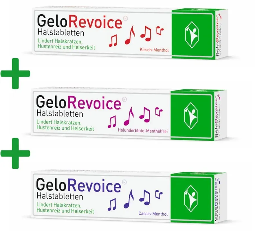 Kategorie: Nahrungsergänzungsmittel - Gelorevoice - Bei Halsschmerzen, Halskratzen, Hustenreiz und Heiserkeit, Hilft schnell spürbar und lang anhaltend - auch bei Stimmenverlust, Schluckbeschwerden und Räusperzwang Wenn die Stimme durch einen Infekt, langes Sprechen oder Singen in Mitleidenschaft gezogen wird, kann GeloRevoice die Beschwerden spürbar schnell lindern. Sie suchen Hilfe bei Halsschmerzen und akuten Schluckbeschwerden? Lutschen Sie gegen Halsweh und Heiserkeit GeloRevoice. Die zuckerfreien Halstabletten legen einen langanhaltenden Schutzfilm auf die Schleimhaut, befeuchten diese und sorgen dadurch für eine Besserung der Stimme. Die Halstabletten sind für GeloRevoice lindert die Symptome dank des einzigartigen Wirkprinzips.Kinder ab sechs Jahren geeignet und in vier verschiedenen Geschmacksrichtungen erhältlich: Kirsch-Menthol, Cassis-Menthol, Grapefruit-Menthol und Holunderblüte-Mentholfrei. Die Halstabletten sind für Kinder ab sechs Jahren geeignet und in vier verschiedenen Geschmacksrichtungen erhältlich: Kirsch-Menthol, Cassis-Menthol, Grapefruit-Menthol und Holunderblüte-Mentholfrei. - 24,99 Euro bei Amazon Marketplace Health & Personal Care - gefunden von billiger.de Dieses GeloRevoice Set mit Muster (3x20 St. & 1x10 St.) für 29.47 Euro ist ideal für Nutzer, die eine größere Menge und eine Probiergröße wünschen. ![]() ![]() GeloRevoice Set mit Muster | 3x 20 St. & 1x 10 St. Lutschtabletten | Bei Halsschmerzen, Halskratzen, Hustenreiz und Heiserkeit | Hilft schnell spürbar und lang anhaltend auch bei Stimmverlust