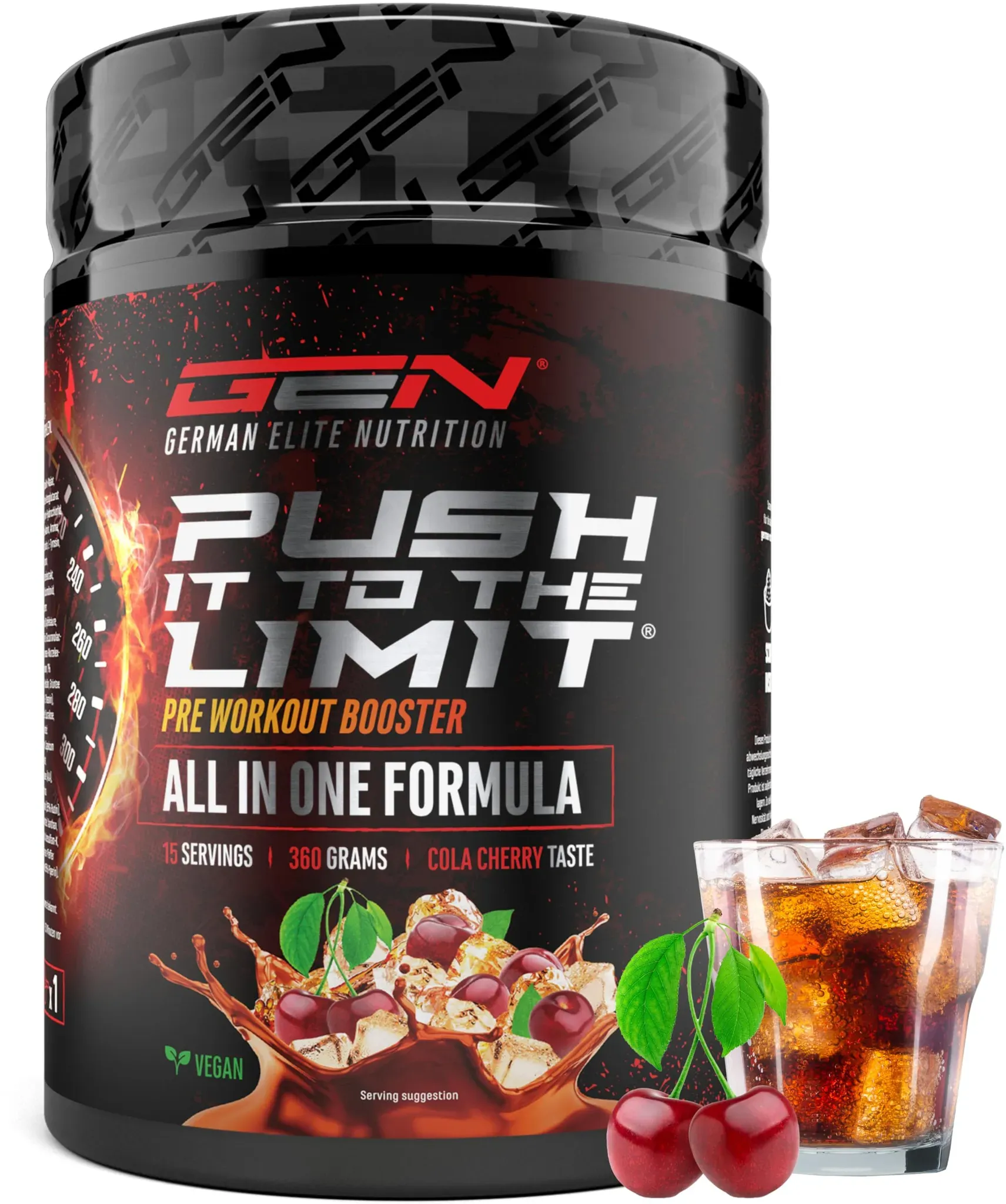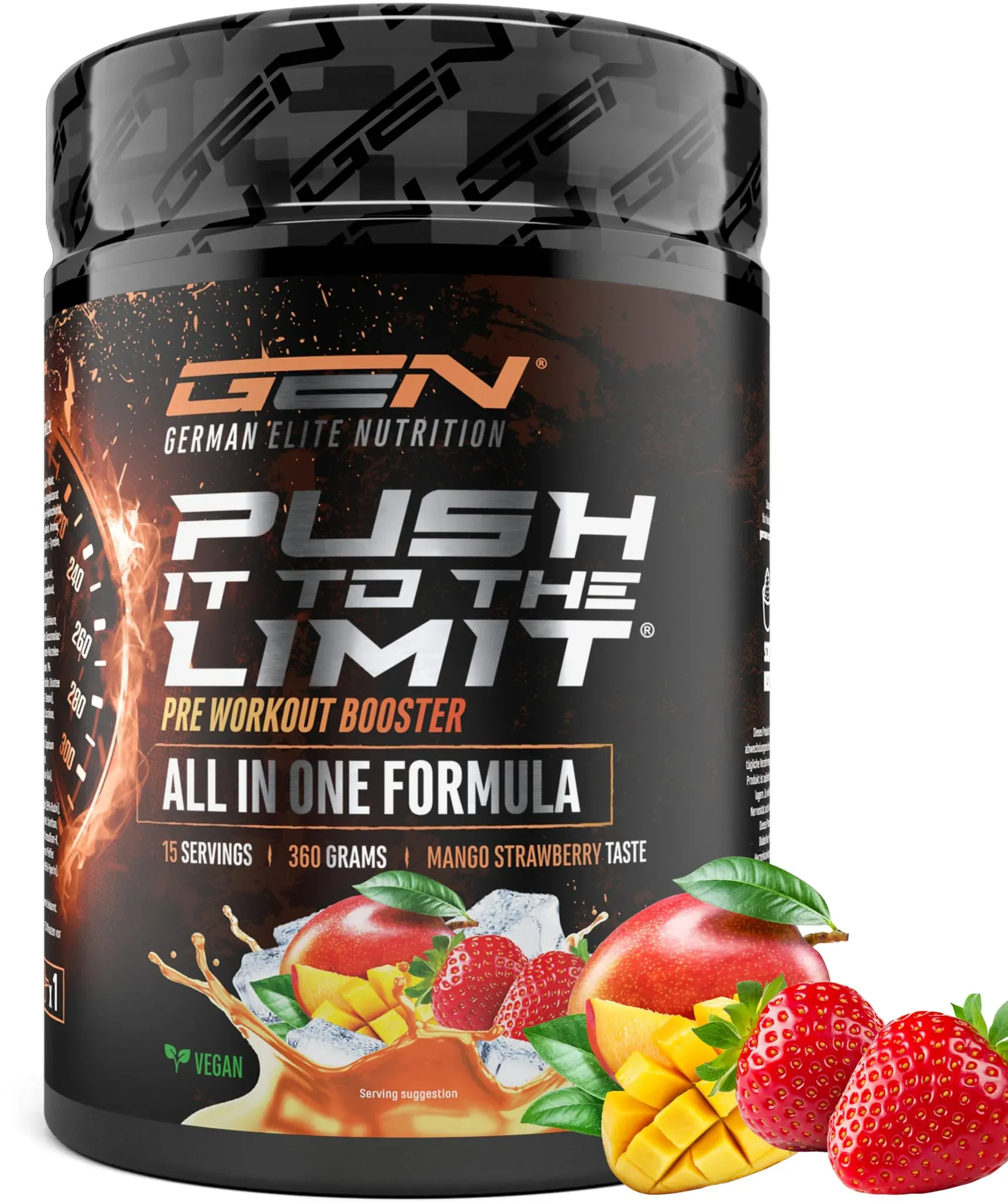 Verfügbarkeit: Auf Lager - Kategorie: Sportnahrung - GEN GERMAN ELITE NUTRITION - GTIN:4260601199480 - INNOVATIVE FORMEL: 360 g Pulver im erfrischenden Mango Strawberry Geschmack. Unser Pre-Workout überzeugt mit einer sorgfältig abgestimmten Mischung aus hochdosierten Aminosäuren und wertvollen Pflanzenextrakten. Jede Portion liefert 24 g (15 Anwendungen pro Dose) für maximale Effektivität. Hervorragende Löslichkeit, spürbare Wirkung und ein leckerer Geschmack machen es zum idealen Trainingsbegleiter! HOCHDOSIERTE ZUSAMMENSETZUNG: Die sorgfältig ausgewählte Rezeptur unseres hochdosierten Pre-Workouts im Detail: L-Citrullin, AAKG, L-Arginin HCL, L-Taurin, Beta-Alanin, L-Carnitin, N-Acetyl-L-Tyrosin, L-Tyrosin, Rote-Bete-Wurzelextrakt, Inositol, Koffein, Glucuronolacton, Rhodiola rosea-Wurzelextrakt, L-Histidin, L-Theanin, Capsicum, Alpha-Liponsäure, Rutin und schwarzer Pfefferfrucht-Extrakt. Jede Zutat wurde gezielt ausgewählt, damit du dich im Training auf deine Ziele fokussieren kannst. WARUM PUSH IT FOR THE LIMIT: Die meisten Pre-Workouts auf dem Markt sind entweder zu niedrig dosiert oder basieren auf Formulierungen ohne fundierten wissenschaftlichen Hintergrund. Zudem werden viele Booster in kostengünstigen Produktionsstätten im EU-Ausland hergestellt, was oft Abstriche bei der Qualität bedeutet. Push It For The Limit steht für eine durchdachte, hochdosierte Rezeptur, die höchsten Qualitätsstandards entspricht. VEGAN & OHNE SCHäDLICHE ZUSäTZE: Unser ... ![]() ![]() GEN GERMAN ELITE NUTRITION Push it to the Limit - Pre Workout mit L-Arginin + Citrullin + L-Tyrosin + L-Theanin + L-Carnitin + AAKG + Taurin + Rhodiola-Rosenwurz + Koffein - Hochdosiert - 360g - Cola Cherry Taste