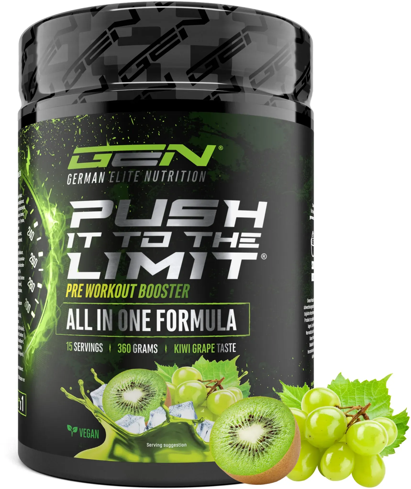 Verfügbarkeit: Auf Lager - Kategorie: Sportnahrung - GEN GERMAN ELITE NUTRITION - GTIN:4260601198155 - INNOVATIVE FORMEL: 360 g Pulver im erfrischenden Kiwi-Trauben-Geschmack. Unser Pre-Workout überzeugt mit einer sorgfältig abgestimmten Mischung aus hochdosierten Aminosäuren und wertvollen Pflanzenextrakten. Jede Portion liefert 24 g mit 15 Anwendungen pro Dose. Hervorragende Löslichkeit und ein leckerer Geschmack machen es zum idealen Trainingsbegleiter! HOCHDOSIERTE ZUSAMMENSETZUNG: Die sorgfältig ausgewählte Rezeptur unseres hochdosierten Pre-Workouts im Detail: L-Citrullin, AAKG, L-Arginin HCL, L-Taurin, Beta-Alanin, L-Carnitin, N-Acetyl-L-Tyrosin, L-Tyrosin, Rote-Bete-Wurzelextrakt, Inositol, Koffein, Glucuronolacton, Rhodiola rosea-Wurzelextrakt, L-Histidin, L-Theanin, Capsicum, Alpha-Liponsäure, Rutin und schwarzer Pfefferfrucht-Extrakt. Jede Zutat wurde gezielt ausgewählt, damit du dich im Training auf deine Ziele fokussieren kannst. WARUM PUSH IT FOR THE LIMIT: Die meisten Pre-Workouts auf dem Markt sind entweder zu niedrig dosiert oder basieren auf Formulierungen ohne fundierten wissenschaftlichen Hintergrund. Zudem werden viele Booster in kostengünstigen Produktionsstätten im EU-Ausland hergestellt, was oft Abstriche bei der Qualität bedeutet. Push It For The Limit steht für eine durchdachte, hochdosierte Rezeptur, die höchsten Qualitätsstandards entspricht. VEGAN & OHNE SCHäDLICHE ZUSäTZE: Unser Drink ist komplett vegan und frei von verbotenen ... ![]() ![]() GEN GERMAN ELITE NUTRITION Push it to the Limit - Pre Workout mit L-Arginin + Citrullin + L-Tyrosin + L-Theanin + L-Carnitin + AAKG + Taurin + Rhodiola-Rosenwurz + Koffein - Hochdosiert - 360g - Kiwi-Grape Taste