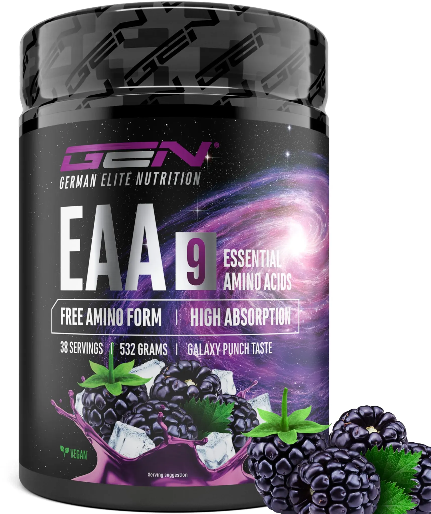 Verfügbarkeit: Auf Lager - Kategorie: Sportnahrung - GEN GERMAN ELITE NUTRITION - GTIN:4262466952354 - VOLLSTäNDIGES AMINOSäURENPROFIL: Die 532 g Dose EAA-Pulver reicht für 38 Tagesportionen à 14 g. Jede Portion enthält 10 g reine, kristalline essentielle Aminosäuren (EAAs), die sich besonders leicht in Wasser lösen und durch ihre hohe Bioverfügbarkeit überzeugen. Das vollständige Profil aller 9 essentiellen Aminosäuren, einschließlich Histidin sowie der BCAA Leucin, Isoleucin und Valin, macht dieses Pulver zur optimalen Ergänzung für deine tägliche Ernährung. HUMAN CODE ZUSAMMENSETZUNG: Die €žHuman Code Formel€œ unseres EAA-Pulvers basiert auf einem präzise abgestimmten Verhältnis der neun essentiellen Aminosäuren, das sich am natürlichen Aminosäureprofil des menschlichen Körpers orientiert. Enthalten sind die drei BCAAs (L-Leucin, L-Valin, L-Isoleucin) sowie L-Phenylalanin, L-Lysin, L-Threonin, L-Methionin, L-Tryptophan und L-Histidin. Diese Kombination ermöglicht eine bedarfsgerechte Zufuhr aller essentiellen Aminosäuren und ist damit ideal geeignet zur Ergänzung der täglichen Ernährung. Unser EAA-Pulver überzeugt durch eine sehr gute Löslichkeit und einen erfrischenden Geschmack. Es lässt sich schnell und vollständig in Wasser auflösen. REIN VEGAN: Unser EAA-Pulver basiert auf veganen, fermentativ gewonnenen Aminosäuren aus Hülsenfrüchten. Es ist laktosefrei, glutenfrei, gentechnikfrei und ohne Konservierungsstoffe. Mit ... Dieses EAA Pulver in Galaxy Punch ist eine beliebte Wahl auf Amazon und bietet alle essentiellen Aminosäuren. ![]() ![]()