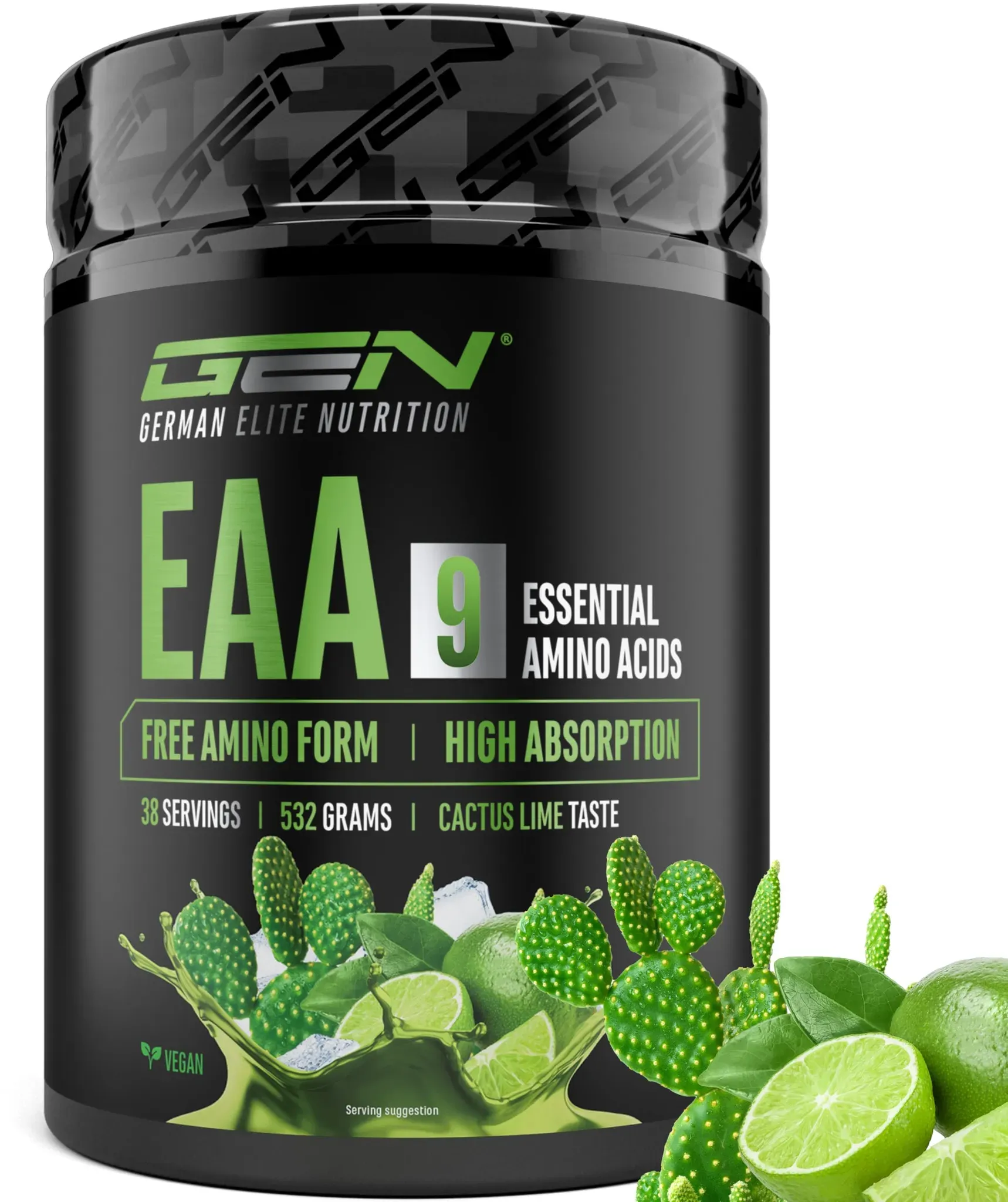 Verfügbarkeit: Auf Lager - Kategorie: Sportnahrung - GEN GERMAN ELITE NUTRITION - GTIN:4262466952255 - VOLLSTäNDIGES AMINOSäURENPROFIL: Die 532 g Dose EAA-Pulver reicht für 38 Tagesportionen à 14 g. Jede Portion enthält 10 g reine, kristalline essentielle Aminosäuren (EAAs), die sich besonders leicht in Wasser lösen und durch ihre hohe Bioverfügbarkeit überzeugen. Das vollständige Profil aller 9 essentiellen Aminosäuren, einschließlich Histidin sowie der BCAA Leucin, Isoleucin und Valin, macht dieses Pulver zur optimalen Ergänzung für deine tägliche Ernährung. HUMAN CODE ZUSAMMENSETZUNG: Die €žHuman Code Formel€œ unseres EAA-Pulvers basiert auf einem präzise abgestimmten Verhältnis der neun essentiellen Aminosäuren, das sich am natürlichen Aminosäureprofil des menschlichen Körpers orientiert. Enthalten sind die drei BCAAs (L-Leucin, L-Valin, L-Isoleucin) sowie L-Phenylalanin, L-Lysin, L-Threonin, L-Methionin, L-Tryptophan und L-Histidin. Diese Kombination ermöglicht eine bedarfsgerechte Zufuhr aller essentiellen Aminosäuren. LECKER & HERVORRAGEND LöSLICH: Unser EAA-Pulver überzeugt durch eine sehr gute Löslichkeit und einen erfrischenden Geschmack. Es lässt sich schnell und vollständig in Wasser auflösen. REIN VEGAN: Unser EAA-Pulver basiert auf veganen, fermentativ gewonnenen Aminosäuren aus Hülsenfrüchten. Es ist laktosefrei, glutenfrei, gentechnikfrei und ohne Konservierungsstoffe. Mit sorgfältig abgestimmten Aromen, Farbstoffen und ... Dieses vegane EAA Pulver mit Human Code Formel in Cactus Lime ist sehr gut löslich und erfrischend. ![]() ![]() GEN GERMAN ELITE NUTRITION EAA Pulver 532 g (38 Portionen) - Alle 9 essentiellen Aminosäuren inkl. Histidin & BCAA - Human Code Formel -Vegan - Sehr gut löslich - Erfrischender Amino Drink (Cactus Lime)