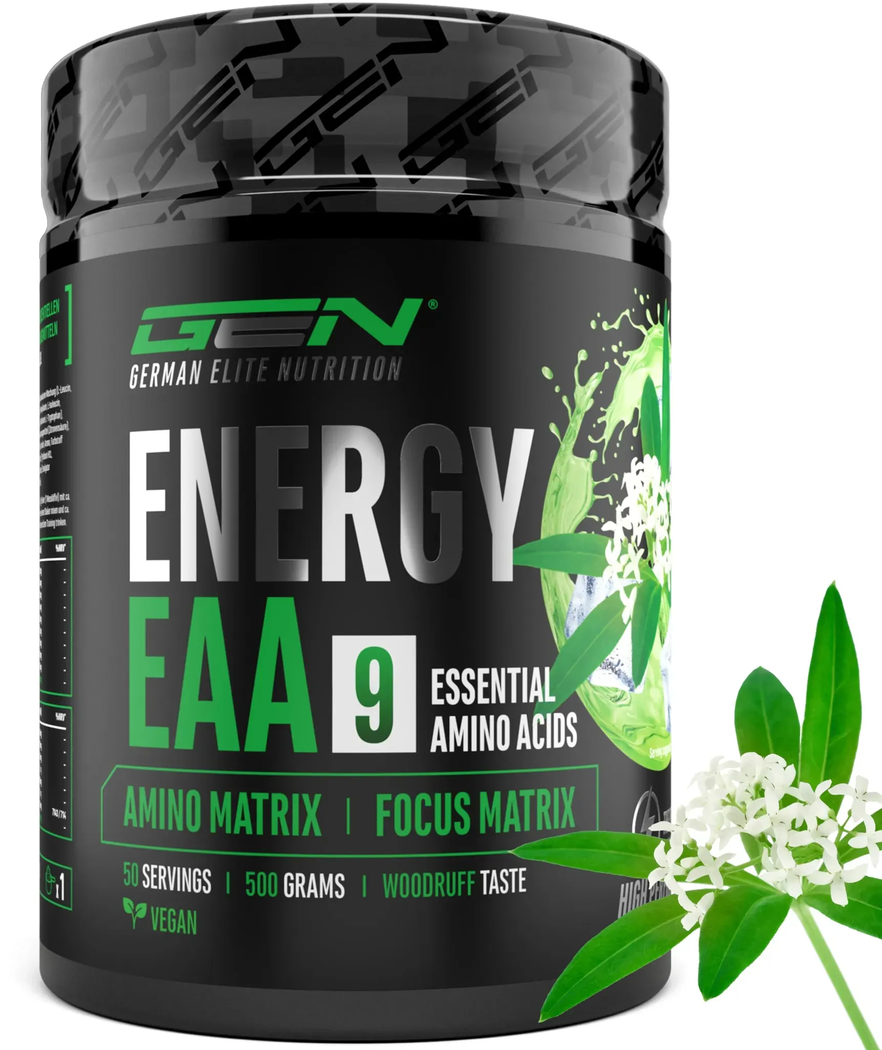 3 Werktage in_stock - Pre-Workouts Fitness Abnehmen,Aminosäuren,EAA Vitamine & Ergänzungen - EAN:4260601198391 - GEN Energy EAA - Deine Alternative zum Pre-Workout-Booster Stell dir vor, du betrittst das Gym mit voller Energie, dein Fokus ist messerscharf, und dein Körper ist bereit, alles zu geben. Kein Zittern, kein Crash - nur pure Leistungsbereitschaft. Das ist GEN Energy EAA, die perfekte Mischung aus essentiellen Aminosäuren und einem Hauch von Energie, die dich bei jedem Training unterstützt. Warum GEN Energy EAA? GEN Energy EAA wurde speziell für all jene entwickelt, die eine Alternative zu herkömmlichen Pre-Workout-Boostern suchen. Mit einer Kombination aus 9 essentiellen Aminosäuren und einer innovativen Focus-Matrix hilft dir unser Produkt, deine Ziele zu erreichen - ohne unnötige Füllstoffe oder Zuckerzusätze. Für wen ist GEN Energy EAA geeignet? Fitness-Enthusiasten: Perfekt für alle, die sich auf Muskelregeneration und Nährstoffversorgung konzentrieren möchten. Sportler mit klarem Fokus: Dank der Focus-Matrix mit Koffein und Taurin bleibst du auch in langen Trainingseinheiten mental stark. Bewusste Genießer: Vegan, glutenfrei und ohne Zucker - ideal für jeden Lebensstil. Was macht GEN Energy EAA einzigartig? Enthält 9 essentielle Aminosäuren (EAAs) wie L-Leucin, L-Isoleucin und L-Valin, die dein Körper benötigt, um optimal zu funktionieren. Innovative Focus-Matrix mit Koffein, Taurin und Guarana-Extrakt für zusätzliche Energie und Konzentration. Vitamin B6 ... Der EAA Energy Mix in Waldmeister ist eine ungewöhnliche und beliebte Geschmacksrichtung für alle, die Abwechslung suchen. Vitaminver sand24.com EAA Energy Mix - Waldmeister, 500 g