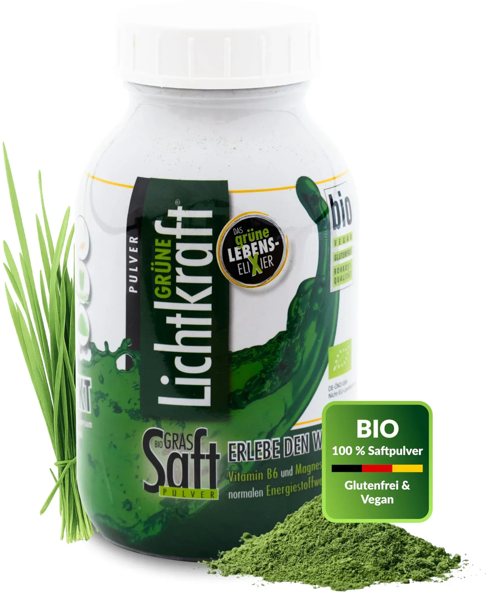 Kategorie: Nahrungsergänzungsmittel - Lichtkraft - GTIN:4050994042032 - MIT MAGNESIUM & VITAMIN B6 FüR ENERGIESTOFFWECHSEL & NERVEN: Vitamin B6 und Magnesium tragen zu einem normalen Energiestoffwechsel und zur normalen Funktion des Nervensystems bei. Unser reines Pflanzensaftpulver liefert diese Mikronährstoffe auf natürlicher Basis ideal zur täglichen Vitalstoffversorgung. GRASSAFTPULVER STATT GEMAHLENEM GRAS: Im Gegensatz zu herkömmlichem Gerstengraspulver enthält Grüne Lichtkraft ausschließlich die extrahierte Essenz aus jungem Gersten- und Kamutgras, gepresst und schonend sprühgetrocknet. Das Ergebnis: ein Pulver mit feiner Textur, hoher Bioverfügbarkeit und fast frei von Ballaststoffen. BIO-ZERTIFIZIERT, VEGAN & OHNE ZUSATZSTOFFE:100 % pflanzlich, ohne Gluten, ohne Trägerstoffe oder künstliche Zusätze verarbeitet unter Rohkostbedingungen. Die vegane Kapselhülle besteht aus pflanzlicher Cellulose und eignet sich ideal für eine bewusste Ernährung. UMWELTBEWUSST VERPACKT BRAUNGLAS STATT PLASTIK: Die lichtgeschützte Braunglasdose mit Schutzetikett bewahrt empfindliche Nährstoffe optimal, ist vollständig recycelbar und mehrfach verwendbar für mehr Nachhaltigkeit im Alltag. OHNE RISIKO TESTEN & ERLEBEN: Dank patentiertem Herstellungsverfahren mit Pressung und Rohkost-Sprühtrocknung entsteht ein besonders hochwertiges Saftpulver. Viele Nutzer schätzen die feine Löslichkeit, gute Verträglichkeit und den Nährstoffreichtum kein gemahlenes Gras, sondern reine Pflanzenkraft. - ... Dieses Produkt bietet Gerstengrasextrakt in Tablettenform, ideal für Anwender, die eine einfache und dosierte Einnahme bevorzugen. ![]() Green Magma Gerstengrasext Bio 320 St Tabletten