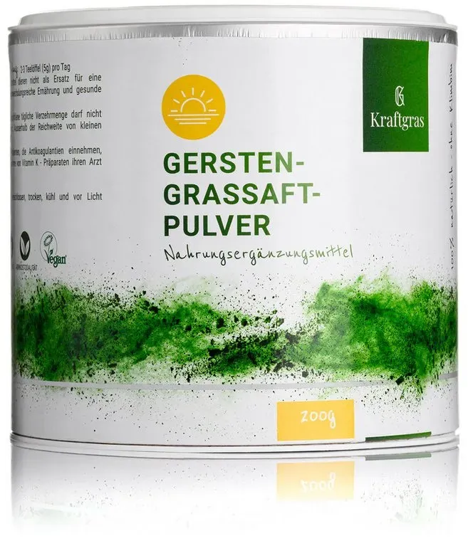 Zustand: Neu - 119,98 € / kg - Ballaststoffe Ballaststoffpräparate - Kopp Vital Kopp Verlag e.K. - 4054239002836 - EAN: 4054239002836 - Gerstengras ist die beliebteste Nahrungsergänzung in Japan und sehr viel nährstoffreicher als andere Blattgemüsesorten oder gar die Körner der Gerste. Vor allem die junge Pflanze hat ein enormes Potenzial und erfreut sich in der Zwischenzeit auch hierzulande großer Beliebtheit. Das Graspulver enthält im Gegensatz zu Grassaftpulver auch die Faserstoffe. Nachteil: Viele unverdauliche Bestandteile des Halmes behindern oft die Lösung und Verdauung der so wichtigen Mikronährstoffe. Viele Menschen reagieren darauf mit Beschwerden und Verdauungsproblemen. Für das Thema der Ballaststoffe gibt es bessere Nahrungsmittel. Auch das angewendete Trocknungsverfahren ist entscheidend für die Wertigkeit. Hochwertige Grassaftpulver werden unmittelbar im Anschluss an die Ernte hergestellt: Nach der Entsaftung wird das Pulver sofort durch ein schonendes Verfahren gewonnen. So bleiben alle Mikronähr- und Pflanzenbegleitstoffe erhalten und können ohne großen Verdauungsaufwand vom Körper aufgenommen werden. Für 1 Kilogramm Grassaftpulver braucht man übrigens 33 Kilogramm frische Gräser! Reinsubstanzen-Prinzip: Gerstengrassaftpulver, frei von Soja, Hefe, Gluten, Laktose und Milchprodukten Anwendungsempfehlung: 1-2 × täglich einen Teelöffel in stilles Wasser oder Säfte einrühren und sofort trinken. - Verkäufer: Kopp Verlag im amazon.de Marketplace Dieses Bio-Gerstengrassaftpulver von KOPP Vital bietet höchste Qualität, ist bio-zertifiziert, vegan und ohne Gentechnik. ![]() ![]() KOPP Vital Bio-Gerstengrassaftpulver | 500 g | Bio-zertifiziert | Vegan | ohne Gentechnik | Laktosefrei | Höchste Qualität