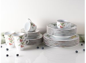 Service Wohnen Gedeckter Tisch Geschirr - - Kombiservice, 30-teilig, »Flora Orchard«, CreaTable. Mit Landhaus Früchte Dekor auf einer Porzellanform in nostalgischem Manufakturstil. Das tolle Obstdekor kombiniert mit einer Karogitterkante schmiegt sich perfekt an die runde Form. Ein verspieltes Geschirr, an dem Sie lange Freude haben werden. Spülmaschinenfest und mikrowellengeeignet. Kombiservice, 30-teilig: je 6 Tassen 20 cl, Untertassen 14,5 cm, Desserteller 21 cm, Speiseteller 27 cm und Suppenteller 22 cm., Material: Material: Porzellan, Materialeigenschaften: mikrowellengeeignet, Optik/Stil: Form Teller: rund, Optik: gemustert, Farbbezeichnung: weiß/bunt, Set-Bestandteile: Dessertteller: 6 Stk., Kaffeetassen: 6 Stk., Speiseteller: 6 Stk., Suppenteller: 6 Stk., Unterteller: 6 Stk., Maßangaben: Fassungsvermögen Kaffeetassen: 200 ml, Durchmesser Speiseteller: 27 cm, Durchmesser Dessertteller: 21 cm, Durchmesser Suppenteller: 22 cm, Durchmesser Unterteller: 14,5 cm, Produktdetails: Einsatzbereich: Haushalt, Party, Anzahl Personen: 6, Hinweise: Pflegehinweise: spülmaschinenfest - Versandkostenfrei: false - Sale: true - Lieferzeit: 1 Woche - product_flag_accessory_wohnen: true - Produktbewertung: High - Sofort verfügbar: true - Hersteller-Farbe: bunt weiß - Farbe: Weiß - - Versand mit Hermes - Zahlungsoptionen: Paypal, Kreditkarte, Rechnung, Lastschrift, Sofortüberweisung, Ratenkauf - bei Baur Versand - gefunden von shopping24 Das SELTMANN WEIDEN Service Marieluise ist ein klassisches Porzellan-Set "Made in Germany" in Creme und Bunt. ![]() Kombiservice SELTMANN WEIDEN 'Geschirr-Set, Service Marieluise', creme, bunt, 30 Stk., Porzellan, Geschirr-Sets, Kombiservice, Teller, Tassen, Untertassen, Made in Germany, 30 Teile, für 6 Personen