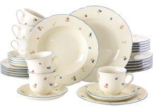 Service Wohnen Gedeckter Tisch Geschirr - - Die dezenten Farben von Mariefleur Gris lassen auf Ihrer Tafel ein Meer von Blumen in Blau und Grau entstehen. Die elegant geschwungenen Formen des Porzellans und das Dekor, inspiriert von Monets Gärten in Giverny, machen das Zubereiten und Servieren Ihrer Speisen gleich nochmal so schön. Seit 1748 steht Villeroy Boch für einfach schönes Geschirr höchster Qualität., Material: Material: Fine China-Porzellan, Materialeigenschaften: mikrowellengeeignet, Optik/Stil: Optik: geblümt, Farbbezeichnung: bunt, Set-Bestandteile: Frühstücksteller: 6 Stk., Kaffeetassen: 6 Stk., Unterteller: 6 Stk., Maßangaben: Fassungsvermögen Kaffeetassen: 250 ml, Durchmesser Unterteller: 16 cm, Durchmesser Frühstücksteller: 21 cm, Produktdetails: Einsatzbereich: Haushalt, Party, Anzahl Personen: 6, Hinweise: Pflegehinweise: spülmaschinengeeignet, Herstellungsland: Made in Germany - Versandkostenfrei: false - Sale: true - Lieferzeit: 3 Tage - Produktbewertung: High - Sofort verfügbar: true - Hersteller-Farbe: bunt - - Versand mit Hermes - Zahlungsoptionen: Paypal, Kreditkarte, Rechnung, Lastschrift, Sofortüberweisung, Ratenkauf - bei Baur Versand - gefunden von shopping24 Ein umfangreiches 30-teiliges Kombiservice aus Porzellan von Seltmann Weiden, Made in Germany, für 6 Personen, das eine komplette Ausstattung bietet. ![]() Kombiservice SELTMANN WEIDEN 'Geschirr-Set, Service Marie-Luise Streublume', creme, bunt, 30 Stk., Porzellan, Geschirr-Sets, Kombiservice, Teller, Tasse, Untertasse, Made in Germany, 30 Teile, für 6 Personen