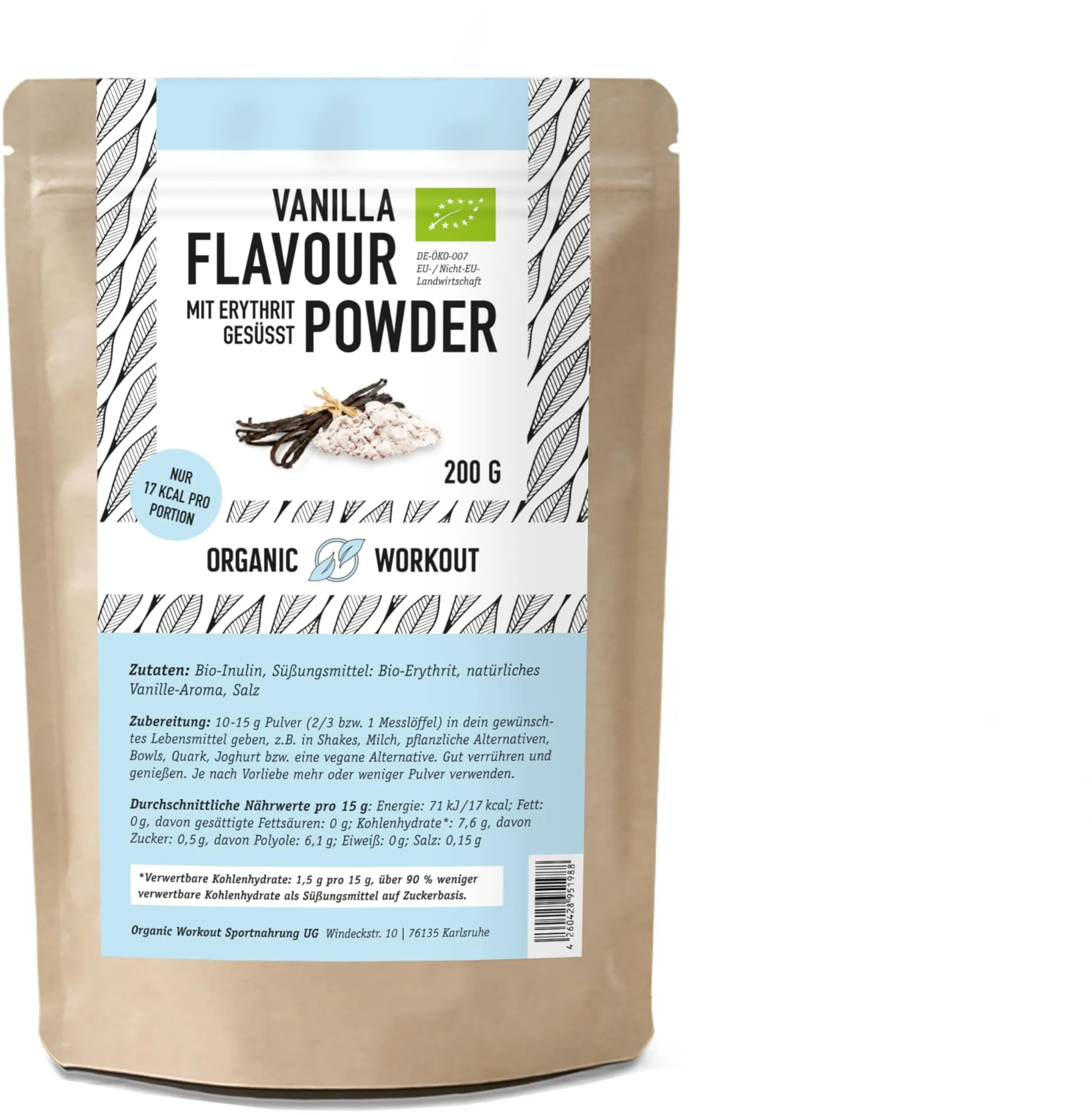 88.78 /1kg - Kategorie: Sportnahrung - Best Body - GTIN:4251650813946 - Produktinformationen Bezeichnung des Nahrungsergänzungsmittels , Best Body Nutrition Holy Flavour, Aromapulver zur Verfeinerung von Speisen und Getränken. Mit Süßungsmittel. Mit Himbeer-Joghurtgeschmack., Verpackungsangaben Inhalt in Gramm , 90 g, Produktdetails Geschmacksrichtung , Raspberry Yoghurt, Darreichungsform , Pulver, Zutaten , Maisdextrin, Aroma, Säuerungsmittel (Citronensäure), färbendes Lebensmittel (Rote Bete Pulver), Süßungsmittel (Sucralose)., Zusatzstoffe , keine, Aufbewahrungshinweise , Das Produkt geschlossen, trocken, lichtgeschützt und bei Raumtemperatur bis max. 25 C lagern. Nach dem öffnen innerhalb von 3 Monaten aufbrauchen., Allergene , keine, Nährwertangaben - davon gesättigte Fettsäuren , 0.1 g, - davon Zucker , 0.5 g, Ballaststoffe , 0.9 g, Eiweiß , 0.5 g, Energie in kcal , 7 kcal, Energie in kJ , 31 kJ, Fett , 0.5 g, Kohlenhydrate , 0.9 g, Nährwertangaben , 2,5 g pro Portion, Salz , 0.01 g, - 7,99 Euro bei OTTO - gefunden von billiger.de Dieses Bio-Vanille-Geschmackspulver ist eine gute Wahl für Kunden, die Wert auf natürliche Inhaltsstoffe und Bio-Qualität legen. ![]() ![]() Bio Vanille Geschmackspulver - Leckerer Geschmack und Süße - ohne künstliche Süßstoffe- Vielseitig einsetzbar für Lebensmittel & Getränke - Flavour Powder - Organic Workout (1er)