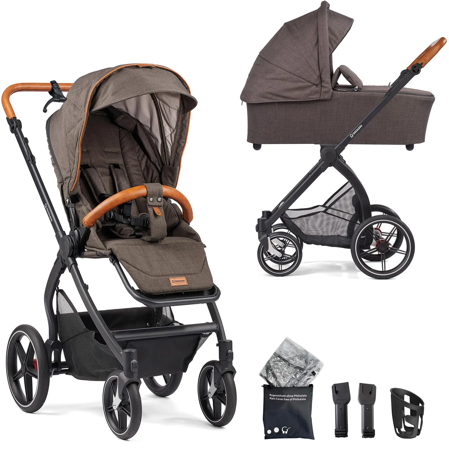 Auf Lager Versand durch AmazonGesslein Kinderwagen 3 in 1 FX4 STYLE, Baby Erstausstattung (leichtes Kinderwagen Set mit Liege- und Sitzoption, individuell einstellbar, Fünf-Punkt-Sicherheitsgurt), Mokka