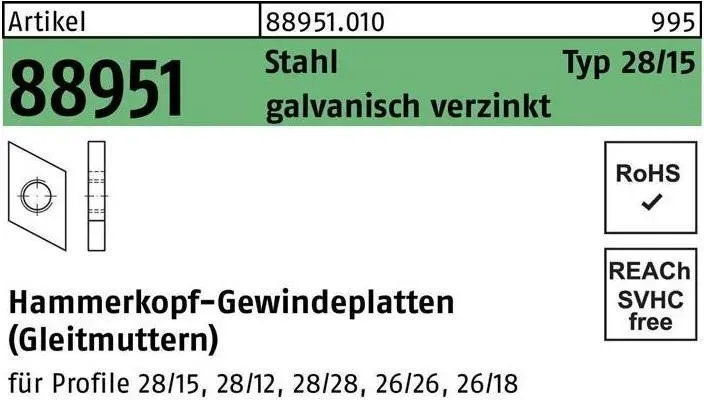 Befestigungstechnik Sonstige - EAN:4043952691595 - Artikel 88951 Stahl Typ 28/15 galvanisch verzinkt Hammerkopf-Gewindeplatten (Gleitmuttern) - Abmessung: M 8 VE=S (100 Stück) (889510100080000) - gefunden von Kelkoo Diese Hammerkopf Gewindeplatte Typ 38/17 für 129,90 Euro ist eine robuste und langlebige Wahl für anspruchsvolle Befestigungen. ![]() Contorion. de