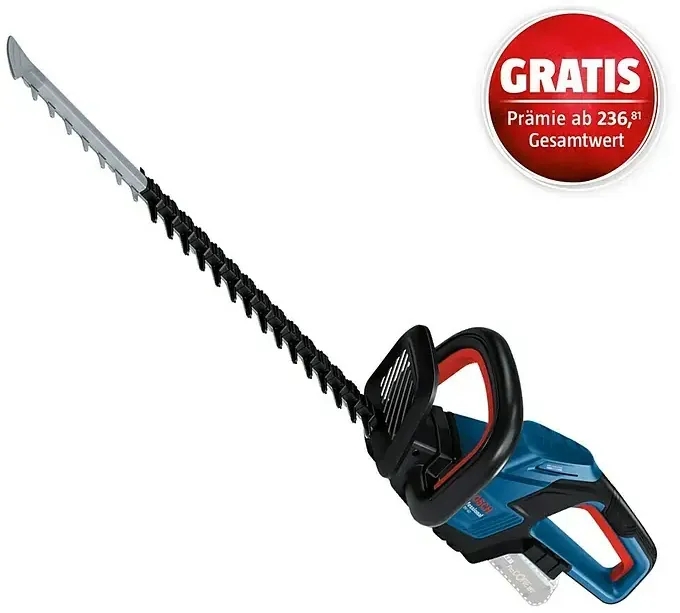 Kategorie: Heckenscheren - Bosch - GTIN:4053423253733 - Die Bosch Professional Akku-Heckenschere GEHE 18V-60 (II) ist der ideale Helfer bei der professionellen Heckenpflege im Garten und leistet kraftvolle Schnitte bei mitteldichten Hecken. Die Heckenschere wird mit einem 18 V Akku betrieben, bietet so einen emissionsfreien Betrieb mit geringer Lautstärke und ist daher ideal für Arbeiten in Wohngebieten geeignet. Kontinuierliches Schneiden dank Anti-Blockier-System Die 60 cm langen Stahlmesser haben eine doppeltwirkende Klinge und schneiden auch dickere äste bis zu einer Stärke von 20 mm reibungslos. Das patentierte Bosch Anti-Blockier-System verhindert mittels elektronischer Erkennung ein Verklemmen des Messers. Der Schneidvorgang wird dann automatisch wiederholt. So kannst du auch hartnäckige äste mühelos und unterbrechungsfrei trimmen. Leichte und ergonomische Akku-Heckenschere Der Heckenschneider punktet mit einer optimalen Balance, sodass auch längere Arbeiten leicht von der Hand gehen. Dank des leichten und ergonomischen Designs treten kaum Ermüdungen auf, auch nicht beim Schneiden von dickeren ästen. Der bürstenlose Motor bietet dabei eine starke Leistung und lange Lebensdauer auch bei anspruchsvollen Arbeiten. Heckenschere mit Akku des AMPShare Akku-Systems Betrieben wird die Heckenschere mit einem 18 V Akku (separat erhältlich) des Bosch Professional 18 V Systems. Alternativ kannst du auch Akkus des flexiblen AMPShare Akku-Systems - powered by Bosch Professional - ... Dieses Solo-Gerät ist zu einem attraktiven Preis erhältlich und eignet sich für alle, die bereits Akkus besitzen. ![]() ![]() Bosch Professional AMPShare 18V Akku-Heckenschere GHE 18V-60 (18 V, Ohne Akku, Schnittlänge: 60 cm)