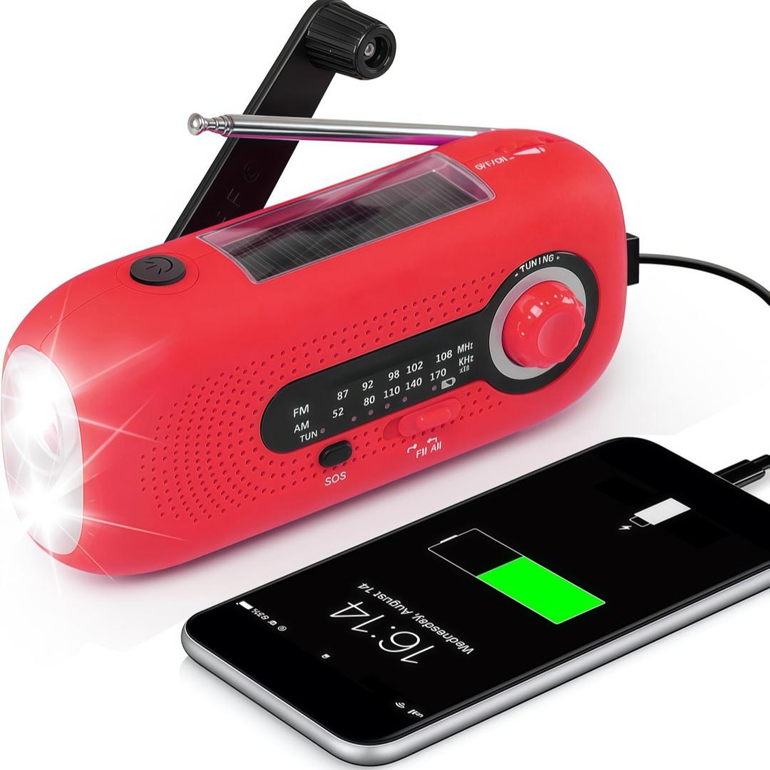 EAN: 0717566436395 - Vier Ladeoptionen:Aufladbar via Solar, Handkurbel, USB oder Batterien4 Beleuchtungsmodi:Fernlicht , Nahlicht , Kombilicht, SOS Alarm mit Blinklicht und Warnsignal.LED Batterie Anzeige:Einfache Kontrolle des Ladezustands.5 stufige Teleskopantenne:Ausziehbar für besseren Empfang, platzsparend verstaubar.Ultrakompaktes Design:Leicht und handlich, passt in jede Tasche.IPX3 Spritzwasserschutz:Geschützt bei Regen und Feuchtigkeit.Notfall-Wetterradio mit AlarmfunktionEmpfängt lokale FM/AM-Sender und NOAA-Wetteralarme, um Sie stets über Gefahren zu informieren. Der große 2000-mAh-Akku ermöglicht langen Betrieb und kann als Powerbank andere Geräte wie Ihr Handy aufladen.4-in-1 LED-Taschenlampe mit SOS-FunktionVier Modi: Nahlicht, Fernlicht (bis zu 10 m), Kombilicht und SOS. Der SOS-Modus aktiviert ein Blinklicht und einen Alarmton für Notsituationen.3 Lademethoden für maximale FlexibilitätAufladbar per Solarpanel, Handkurbel (Dynamo) oder USB-Kabel. Ideal für den Notfall und den Alltag. Integrierter Spannungsregler für sicheres Laden. Robustes & wasserdichtes GehäuseABS-Kunststoffgehäuse mit IPX3-Wasserschutz geeignet für den Einsatz im Freien bei jedem Wetter.Lange Laufzeit & praktische Powerbank-FunktionBis zu 6-7 Stunden Radio- oder 15 Stunden LED-Betrieb pro Ladung. Laden Sie unterwegs Ihr Smartphone auf, um verbunden zu bleiben.SPEZIFIKATION:Farbe: RotMaterial: ABSFunktionen: Radio, Taschenlampe, Notfall-PowerbankFrequenzbereich: AM 5201710KHz, FM 87108 ... Mit einem 4000mAh Akku bietet dieses Kurbelradio eine längere Betriebszeit und mehr Kapazität für die Powerbank-Funktion. ![]() kaufland.d e GIDEALED Solar radio,Selbstbetriebenes Kurbelradio mit LEDTaschenlampe,Notfallradio AM/FM Wetter Wind Up Radio mit 4000-mAh-Akku,Notbeleuchtung,Wiederaufladbar