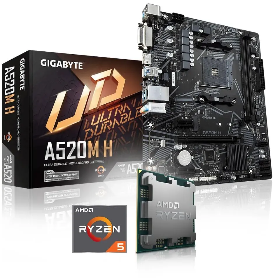 Mainboard mit CPU-Sockel Sockel AM4 Motherboards - EAN:4719331810696 - Das GIGABYTE A520M DS3H V2 basiert auf dem AMD-A520-Chipsatz und unterstützt AMD-Prozessoren für den Sockel AM4. Es verfügt über vier DDR4-Slots für bis zu 128 GB Arbeitsspeicher. Zur weiteren Ausstattung des GIGABYTE A520M DS3H V2 gehören ein PCIe-3.0-x16-Slot und ein PCIe-3.0-x1-Slot. Außerdem verfügt das GIGABYTE A520M DS3H V2 über 8-Kanal-Sound, eine Gigabit-LAN-Schnittstelle, vier SATA3-Anschlüsse, Wi-Fi 6, Bluetooth, einen M.2-Anschluss und eine Reihe an USB Schnittstellen. - gefunden von Kelkoo Dieses Bundle ist eine kostengünstige Möglichkeit, ein Mainboard mit einem Ryzen 5 5500 und CPU-Kühler zu erwerben. ![]() ![]() PC Bundle - AufrüstKit Ryzen eBay 5 5500 6x4,2GHz + Gigabyte A520M DS3H + CPU Kühler