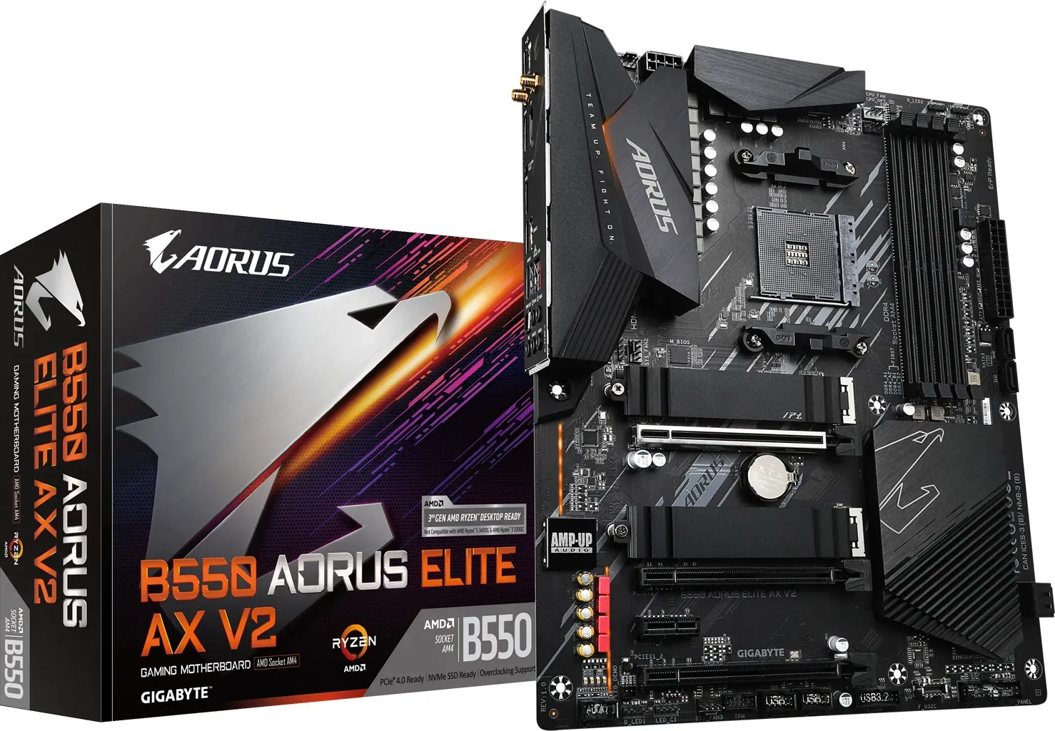Gigabyte - EAN: 4719331809904 - Gigabyte AORUS Elite AX V2 (Rev. 1.1) AMD B550 So.AM4 DDR4 ATX Retail - bei mindfactory.de - aus Yadore Produktdaten Alternate.de bietet das Gigabyte B550 AORUS ELITE AX V2 für 132.90 Euro an, eine solide Wahl von einem etablierten Händler. ![]() Gigabyte B550 AORUS ELITE AX V2, Mainboard