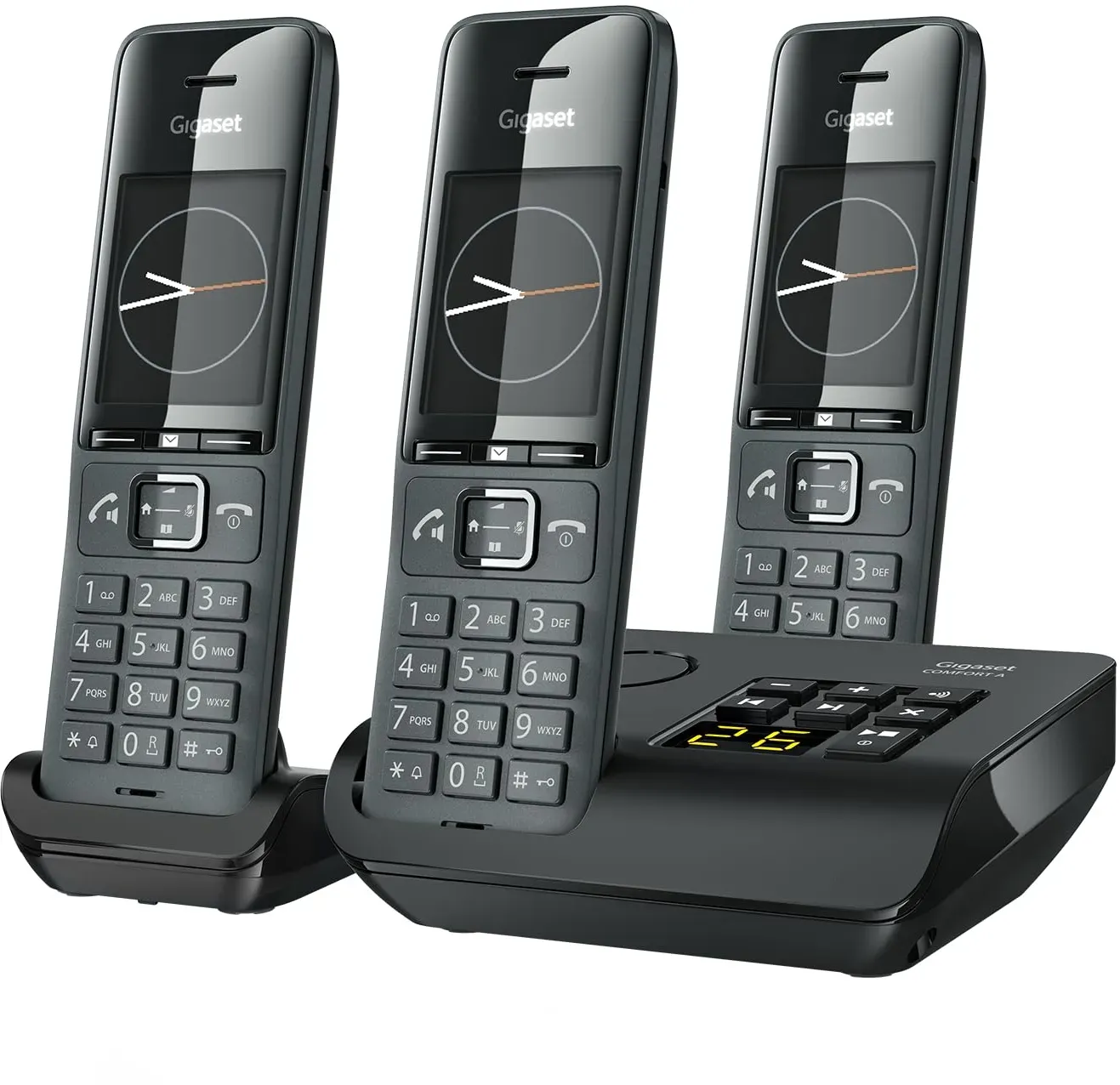 EAN: 4250366865997 - TECHNOLOGIE TRIFFT AUF DESIGN - Das Gigaset COMFORT 520 besticht durch edles, zeitloses Design, dem 2,2' großem Farbdisplay und geringem Gewicht - Optimal für Ihr Zuhause oder HomeofficeüBERZEUGENDE FUNKTIONEN - Telefonieren und Freisprechen in brillanter Sprachqualität - Headset-Kompatibilität via 3,5mm Klinkenanschluss - Komfort-Anrufschutz für 150 Nummern und großem AdressbuchEINFACHE INSTALLATION - Einfach die Basisstation mit der Wandtelefondose verbinden und direkt los telefonieren - profitieren Sie von einer schnellen und leichten Einrichtung Ihres neuen TelefonsLIEFERUMFANG - 1x Gigaset COMFORT 520A Basisstation mit AB, 2x Gigaset COMFORT 520A Mobilteil, 1x Ladeschale, 2x Steckernetzteil, 1x Telefonanschlusskabel (TAE), 4x AAA-Akku (NiMH), 2x Akku-Deckel, 2x Gürtelclip, 1x BedienungsanleitungPerfekte Ergonomie und höchster KomfortDas Gigaset COMFORT 520 überzeugt mit zeitlos-edlem Design und perfekter Ergonomie.Willkommen in Ihrer persönlichen Komfortzone!Brilliantes, 44 x 35 mm Farbdisplay und nützlicher Jumbo Modus mit extragroßer Ziffernanzeige.Wir bleiben in Kontakt! Einfach und komfortabel.Ungestört Spaß habenAuf den integrierten Anrufbeantworter des Gigaset COMFORT 520A können Sie sich zu jeder Zeit verlassen. Er zeichnet Anrufe auf, wenn Sie unterwegs oder verhindert sind oder gerade keine Lust zum Telefonieren haben. Sie entscheiden, wann und wo Sie Nachrichten abhören wollen: über das Mobilteil, die Basisstation oder per ... Dieses Trio-Set ist eine gute Wahl für größere Haushalte, die drei Telefone mit Anrufbeantworter benötigen. ![]() ![]() Gigaset Comfort 520A Trio titan/schwarz