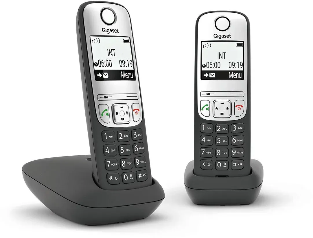 Schnurlose Telefone - EAN:4250366855684 - Das Gigaset A690 Duo Schnurlose Telefon-Set schwarz - komfortabel telefonieren im SetDank des Gigaset A690 Duo Schnurlosen Telefon-Sets schwarz decken Sie mit Ihrem Festnetz den maximal möglichen Raum ab. Das aus zwei Mobilteilen bestehende Set sorgt dafür, dass Sie immer schnell am Hörer sind - auch wenn Ihre Räumlichkeiten zum Beispiel mehrere Etagen umfassen. Ein weiterer Vorteil ist, dass kein Kabel den Hörer und die Basis verbindet. So genießen Sie maximale Bewegungsfreiheit. Zusätzlich ist das Gerät auf bis zu 4 Mobilteile erweiterbar.Bestimmte Rufnummern sperrenDiese Funktionen stehen Ihnen zur Verfügung, wenn Sie angerufen werden bzw. Anrufe tätigen möchten:Optische Anrufanzeige: Eine Leuchte zeigt an, dass ein Anruf eingehtCLIP-Funktion: Die Rufnummer des Anrufers wird angezeigtAnruferliste für ankommende AnrufeAnrufsperre für eingehende und ausgehende AnrufeWahlwiederholung: Rufen Sie die zuletzt gewählte Nummer erneut anVibrationsalarm: Das Gerät vibriert, wenn ein Anruf eingehtNachtmodus: Schalten Sie das Gerät zum Beispiel nachts lautlosWichtiges Kriterium: die AkkulaufzeitDie Mobilteile haben eine Funkreichweite von bis zu 300 m im Freien und bis zu 50 m in Gebäuden - so sind Sie unabhängig von der Basisstation. Der Micro AAA, Ni-MH-Akku ist voll geladen für bis zu 14 Std. Sprechzeit sowie bis zu 180 Std. Standbyzeit ausgelegt. Lange Gespräche ohne Unterbrechung sind somit jederzeit möglich.Hände frei dank ... Dieses Modell ist eine gute Wahl für Nutzer, die ein einfaches und funktionales Duo-Telefon ohne Anrufbeantworter suchen. ![]() ![]()