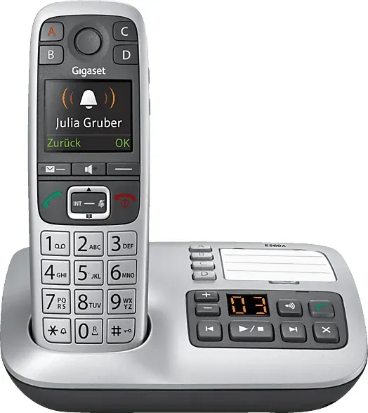 Zustand: Neu - Mit Anrufbeantworter Schnurlose Festnetztelefone mit Anrufbeantworter - Gigaset Gigaset Technologies GmbH - S30852-H2728-B101 - EAN: 4250366848655 EAN: 4250366848662 - FÜR MEHR SICHERHEIT - Vier Direktwahltasten für besonders wichtige Rufnummern, Taste A dient als spezielle Notruftaste, speichern Sie auf dieser Taste bis zu vier SOS-Nummern gleichzeitig. Nur in Deutschland kompatibel - Mehr Informationen auf der Gigaset Homepage. GROßER ANSPRUCH, EINFACHE BEDIENUNG - Extra-Laut€-Taste zur Verdoppelung der Hörerlautstärke, exzellente Akustik im Freisprechmodus, Anrufbeantworter mit bis zu 25 Min Aufnahmezeit EINFACHE INSTALLATION - Einfach die Basisstation mit der Wandtelefondose verbinden und direkt los telefonieren, profitieren Sie von einer schnellen und leichten Einrichtung Ihres neuen Telefons QUALITÄT MADE IN GERMANY - Design und Herstellung in Deutschland, die umweltfreundliche ECO DECT Technologie sorgt für einen reduzierten Energieverbrauch LIEFERUMFANG - 1x Basisstation mit integriertem Anrufbeantworter, 1x Mobilteil Gigaset E560A, 1x Steckernetzteil, 1x Telefonanschlusskabel, 2x AAA-Akku (NiMH), 1x Bedienungsanleitung Sie haben Fragen zu diesem Produkt? Kontaktieren Sie den Gigaset Kundenservice unter 02871-912 912 (zum Festnetztarif Ihres Anbieters) - bei Amazon.de Ein sehr gutes Preis-Leistungs-Verhältnis für ein neues Gerät mit Anrufbeantworter von einem bekannten Händler. ![]() ![]() GIGASET E560A Schnurloses Telefon mit Anrufbeantworter