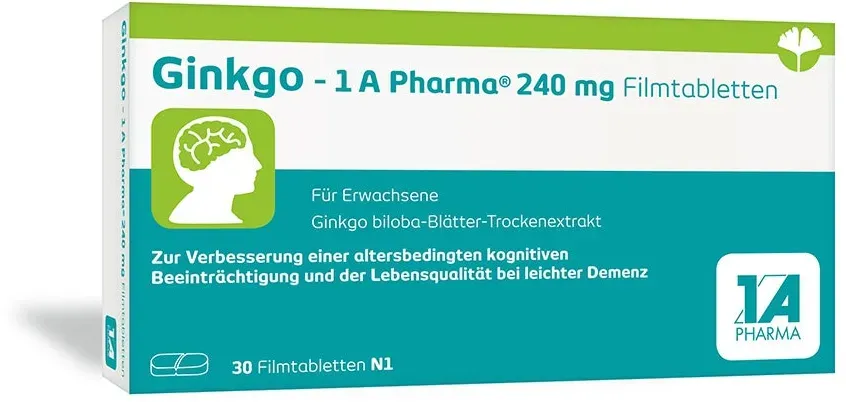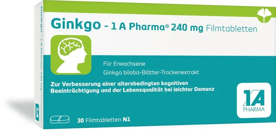 0,51 /Stück - Kategorie: Arzneimittel - 1 A Pharma - GTIN:4150141288730 - PZN:14128873 - Anwendungsgebiet von Ginkgo-1A Pharma 240 mg FilmtablettenGinkgo-1A Pharma 240 mg Filmtabletten ist ist ein pflanzliches Arzneimittel zur Verbesserung einer altersbedingten kognitiven Beeinträchtigung und der Lebensqualität bei leichter Demenz. Ginkgo: Natürliche Gedächtnisstärkung Die Inhaltsstoffe des Trockenextraktes aus den Ginkgo-Blättern zeichnen sich durch ihre durchblutungsfördernde Wirkung aus. Der in Ginkgo 1 A Pharma enthaltene Trockenextrakt setzt sich aus Pflanzeninhaltsstoffen wie Ginkgoliden, Bilobalid und Flavonoiden zusammen. Diese fördern die Aktivität der Botenstoffe im Gehirn und sorgen für eine verbesserte Informationsübertragung zwischen den Nervenzellen. Gut zu wissen: Ginkgo 1 A Pharma 240 mg Filmtabletten gibt es auch niedriger dosiert als Ginkgo biloba 1 A Pharma 120 mg Filmtabletten. Ginkgo 1 A Pharma 240 mg mit einem Extrakt aus Ginkgo-Blättern Pflanzliches Arzneimittel zur Verbesserung einer altersbedingten kognitiven Beeinträchtigung bei leichter DemenzZur Verbesserung der Lebensqualität bei leichter DemenzWirkt durch Ginkgo-biloba-Blätter-Trockenextrakt mit Verbesserung der DurchblutungFür Erwachsene ab 1 n Geistige Leistungsfähigkeit im Alter verbessern* Kontinuierliches Vergessen von Tätigkeiten oder Verlegen von Gegenständen bis hin zu Konzentrationsschwierigkeiten im Alter können Hinweise auf eine leichte Demenz sein. Wenn die geistige ... Dieses Angebot ist mit 15,69 Euro eine solide Option für 30 Tabletten. ![]() ![]() 1 A Pharma Ginkgo-1A Pharma 240 mg Filmtabletten