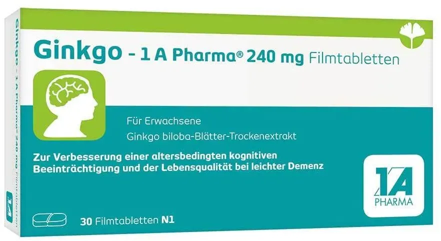 0.67 eur / 1st - 'Arzneimittel-Gesundheit Herz, Kreislauf & Gefäße Gedächtnis & Konzentration' Medizin & Heilmittel - EAN:4150141288730 - Bei geistigen Leistungs- und DurchblutungsstörungenZur symptomatischen Behandlung von hirnorganisch bedingten geistigen Leistungseinbußen im Rahmen eines therapeutischen Gesamtkonzeptes bei Abnahme bzw. Verlust erworbener geistiger Fähigkeiten (dementiellen Syndromen) mit den Hauptbeschwerden:GedächtnisstörungenKonzentrationsstörungenNiedergeschlagenheitSchwindelOhrensausenK opfschmerzen - gefunden von Kelkoo Dieses Angebot ist mit 20,72 Euro eine gute Option für 30 Tabletten. ![]() ![]() 1 A Pharma GINKGO-1A Pharma 240 mg Filmtabletten 30 St