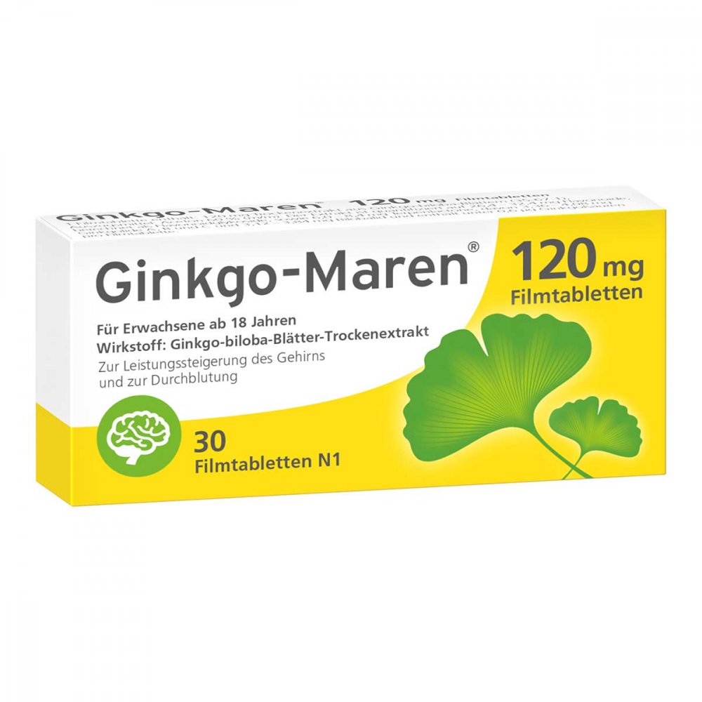 0,28 €/Stück - Kategorie: Arzneimittel - Hermes Arzneimittel - GTIN:4150092066548 - PZN:09206654 - Ginkgo-Maren 120 mg Filmtabletten Wirkstoff: Ginkgo-biloba-Blätter-Trockenextrakt. Anwendungsgebiete: Zur symptomatischen Behandlung von hirnorganisch bedingten Leistungsstörungen im Rahmen eines therapeutischen Gesamtkonzeptes bei Abnahme bzw. Verlust erworbener geistiger Fähigkeiten (dementielles Syndrom) mit den Hauptbeschwerden: Gedächtnisstörungen, Konzentrationsstörungen, depressive Verstimmung, Schwindel, Ohrensausen, Kopfschmerzen. Das individuelle Ansprechen auf die Medikation kann nicht vorausgesagt werden. Bevor die Behandlung mit Ginkgo-Maren begonnen wird, sollte geklärt werden, ob die Krankheitszeichen nicht auf einer spezifisch zu behandelnden Grunderkrankung beruhen. Hinweis: Enthält Lactose und Glucose. - 16,57 Euro bei Preisapo - gefunden von billiger.de Dieses Angebot von APONEO im Amazon Marketplace für 22.26 Euro für 60 Tabletten ist eine bequeme Kaufoption. ![]() ![]() GINKGO-MAREN 120 mg Filmtabletten 60 St