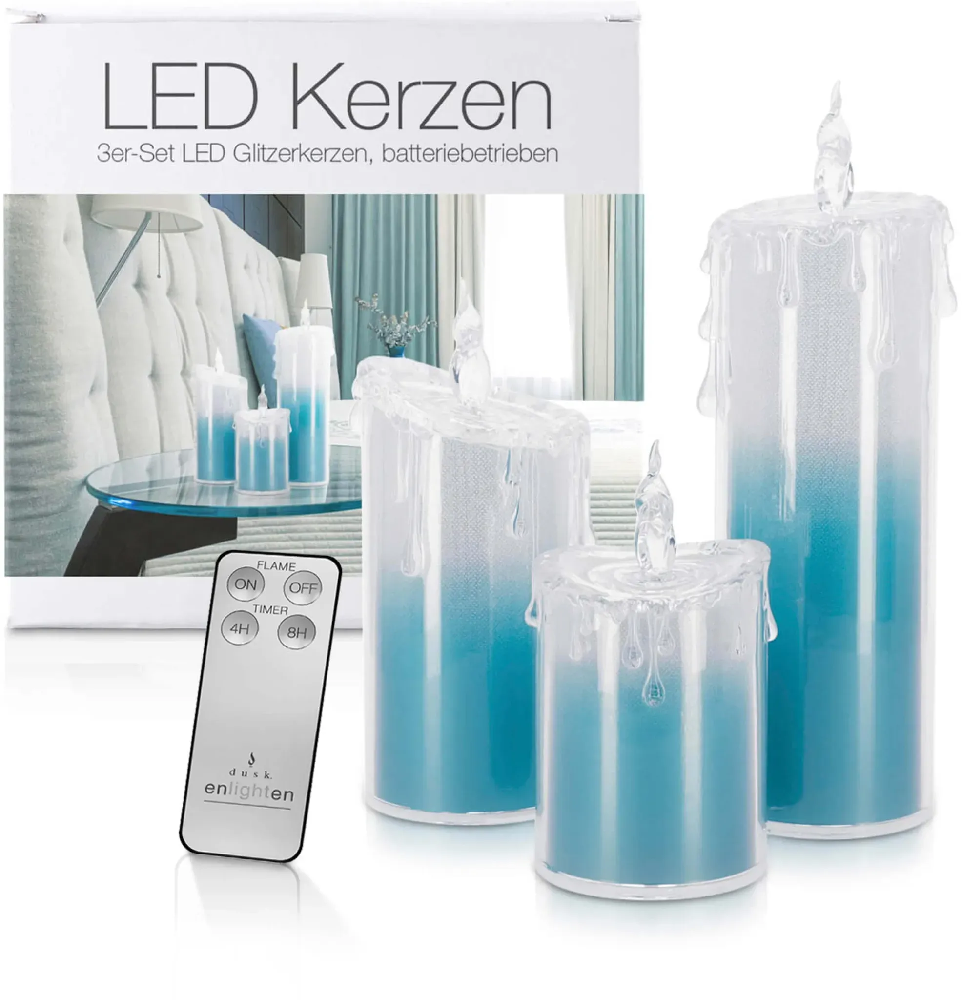 Zustand: Neu - LED Kerzen - LED Universum - 10111245 - EAN: 4250699242748 - WUNDERVOLLES LICHT: Ein absolutes Muss für die weihnachtlich geschmückte Wohnung: die LED Kerzen beeindrucken mit ihrem silbernen Glitzerdesign und leuchten in einem angenehmen Kaltweiß. GLITZERDESIGN: Auch im ausgeschalteten Zustand sind die LED Kerzen dank des glitzernden Verlaufs von Silber nach Weiß ein stylisches Dekorationselement. FLACKEREFFEKT: Eine extra LED in der angedeuteten Flamme schafft durch ihr Flackern einen zusätzlichen Kerzeneffekt. GRÖSSEN: Alle drei Kerzen haben einen Durchmesser von 7,5cm. Die unterschiedlichen Höhen sind: Klein: 13,5cm, Mittel: 17cm, Groß: 24cm . STEUERUNG & ENERGIEVERSORGUNG: Die 3 LED Kerzen haben eine Timerfunktion und können mit der Fernbedienung gesteuert werden. Sie werden mit jeweils drei AAA-Batterien (nicht inklusive) betrieben. - Verkäufer: LED Universum im amazon.de Marketplace ![]() ![]() LED Universum - LED Acryl Glitzerkerzen Set ?Liza?, 13,5 cm | 17 cm | 24 cm, inkl. IR-Fernbedienung & Timer, Batteriebetrieben je 3 x AAA (nicht inkl.) (3er Set Blau)