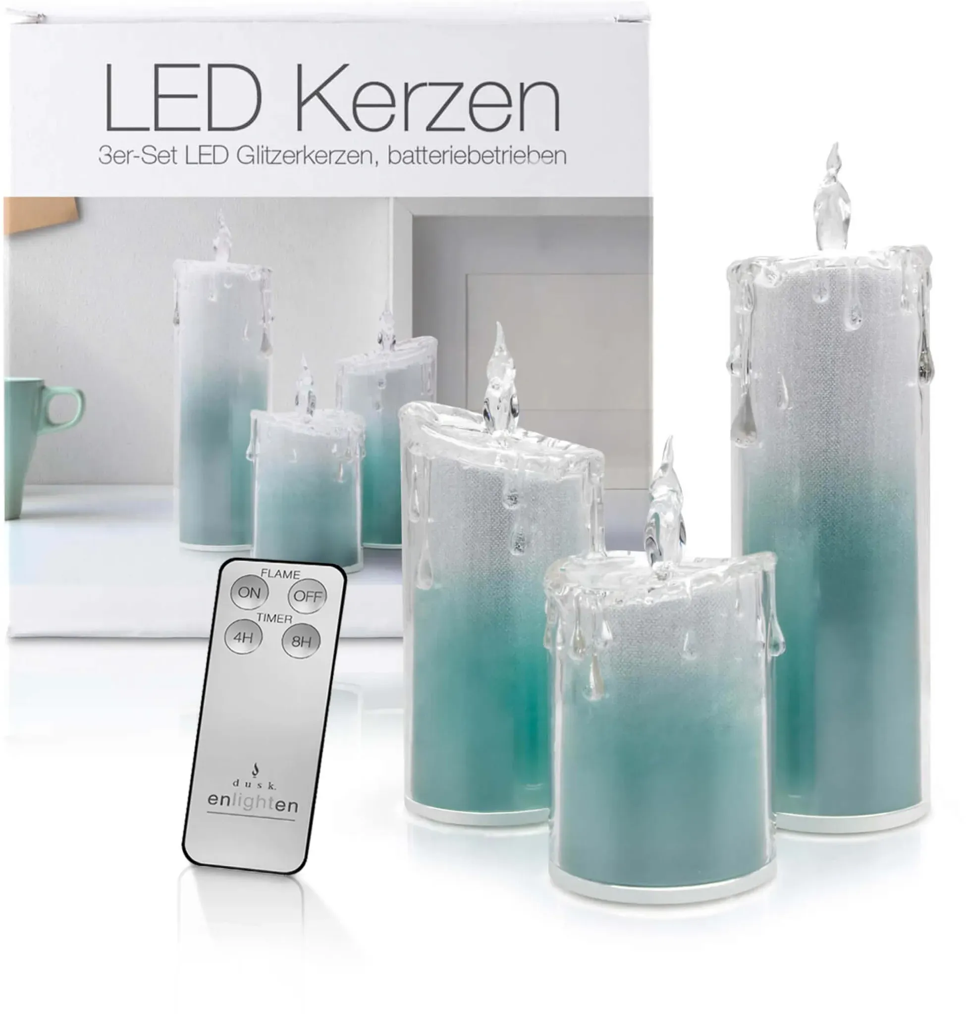Kategorie: Kerzen - LED Universum - GTIN:4250699243097 - WUNDERVOLLES LICHT: Ein absolutes Muss für die weihnachtlich geschmückte Wohnung: die LED Kerzen beeindrucken mit ihrem türkisen Glitzerdesign und leuchten in einem angenehmen Kaltweiß GLITZERDESIGN: Auch im ausgeschalteten Zustand sind die LED Kerzen dank des glitzernden Verlaufs von Türkis nach Weiß ein stylisches Dekorationselement. FLACKEREFFEKT: Eine extra LED in der angedeuteten Flamme schafft durch ihr Flackern einen zusätzlichen Kerzeneffekt. GRöSSEN: Alle drei Kerzen haben einen Durchmesser von 7,5cm. Die unterschiedlichen Höhen sind: Klein: 13,5cm, Mittel: 17cm, Groß: 24cm . STEUERUNG & ENERGIEVERSORGUNG: Die 3 LED Kerzen haben eine Timerfunktion und können mit der Fernbedienung gesteuert werden. Sie werden mit jeweils drei AAA-Batterien (nicht inklusive) betrieben. - 34,99 Euro bei Amazon Marketplace Home - gefunden von billiger.de ![]() ![]() LED Universum - LED Acryl Glitzerkerzen Set Liza , 13,5 cm | 17 cm | 24 cm, inkl. IR-Fernbedienung & Timer, Batteriebetrieben je 3 x AAA (nicht inkl.) (3er Set Blau)