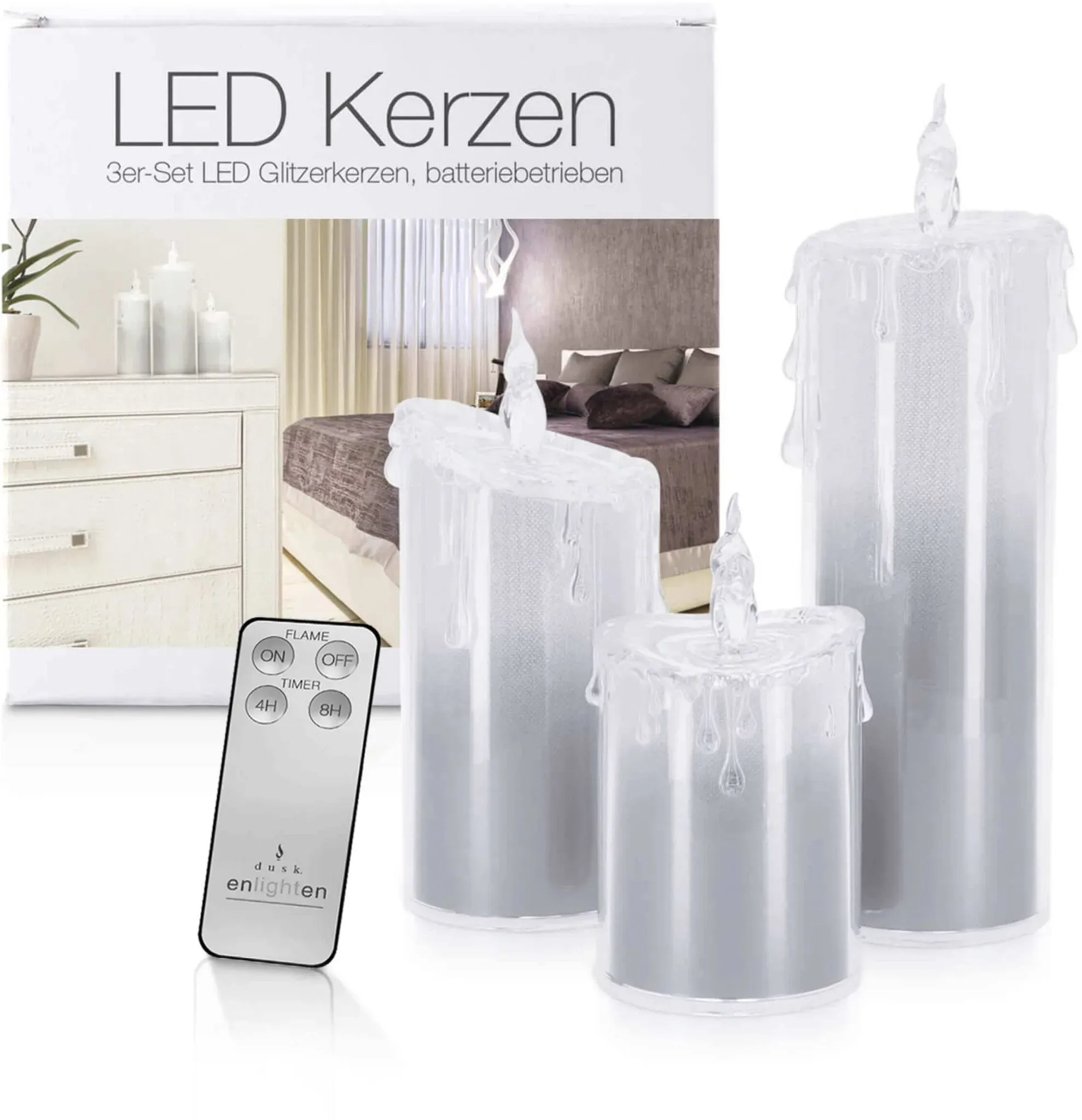 Kategorie: Kerzen - LED Universum - GTIN:4250699242755 - WUNDERVOLLES LICHT: Ein absolutes Muss für die weihnachtlich geschmückte Wohnung: die LED Kerzen beeindrucken mit ihrem blauen Glitzerdesign und leuchten in einem angenehmen Kaltweiß. GLITZERDESIGN: Auch im ausgeschalteten Zustand sind die LED Kerzen dank des glitzernden Verlaufs von Dunkelblau nach Weiß ein stylisches Dekorationselement. FLACKEREFFEKT: Eine extra LED in der angedeuteten Flamme schafft durch ihr Flackern einen zusätzlichen Kerzeneffekt. GRöSSEN: Alle drei Kerzen haben einen Durchmesser von 7,5cm. Die unterschiedlichen Höhen sind: Klein: 13,5cm, Mittel: 17cm, Groß: 24cm . STEUERUNG & ENERGIEVERSORGUNG: Die 3 LED Kerzen haben eine Timerfunktion und können mit der Fernbedienung gesteuert werden. Sie werden mit jeweils drei AAA-Batterien (nicht inklusive) betrieben. - 34,99 Euro bei Amazon Marketplace Home - gefunden von billiger.de ![]() ![]() LED Universum - LED Acryl Glitzerkerzen Set Liza , 13,5 cm | 17 cm | 24 cm, inkl. IR-Fernbedienung & Timer, Batteriebetrieben je 3 x AAA (nicht inkl.) (3er Set Silber)